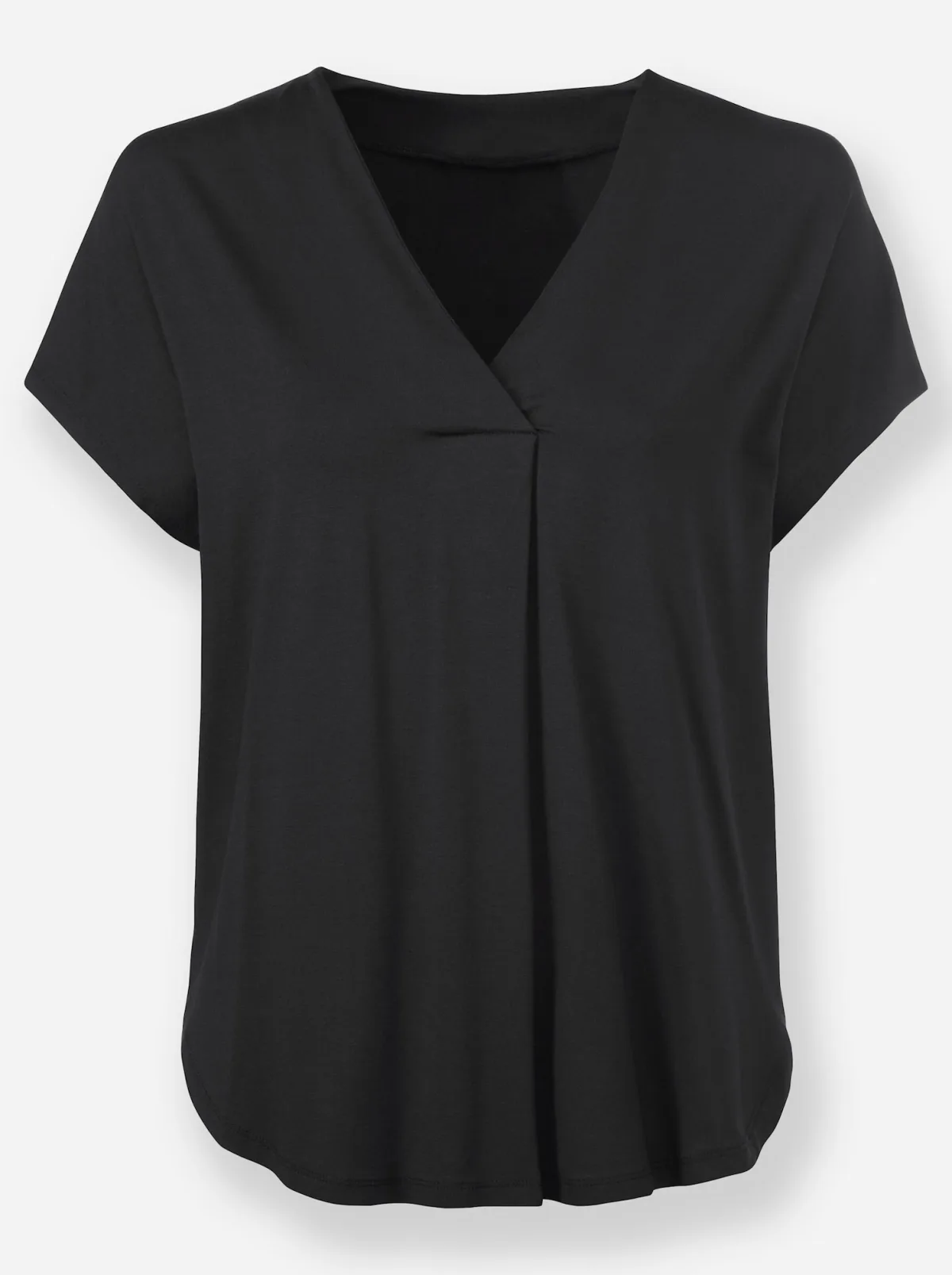 Design: Gevoerde zoom/rand; Materiaal: Jersey; Halstype: V-hals; Motief: Effen; Details: Plooien, Gedrapeerd; Extra's: Op staal naden; Pasvorm: Normale pasvorm; Armlengte: Kwartmouw; Lengte: Normale lengte