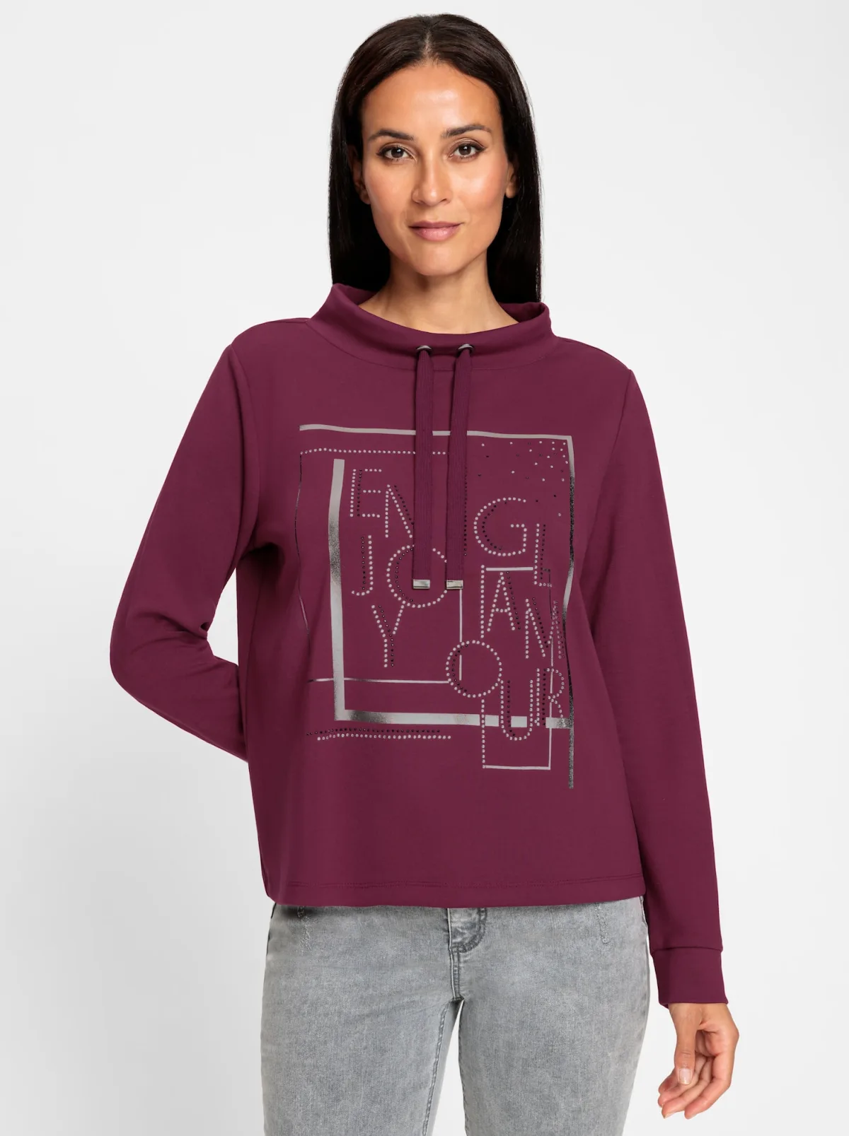 Design: Geribd ceintuurtje, Staande kraag, Geaccentueerd tunnelkoord; Materiaal: Sweatstof; Halstype: Opstaande kraag; Motief: Tekst print; Details: Sierstenen; Extra's: Glitterend, Applicaties; Pasvorm: Normale pasvorm; Armlengte: Lange mouw; Lengte: Normale lengte
