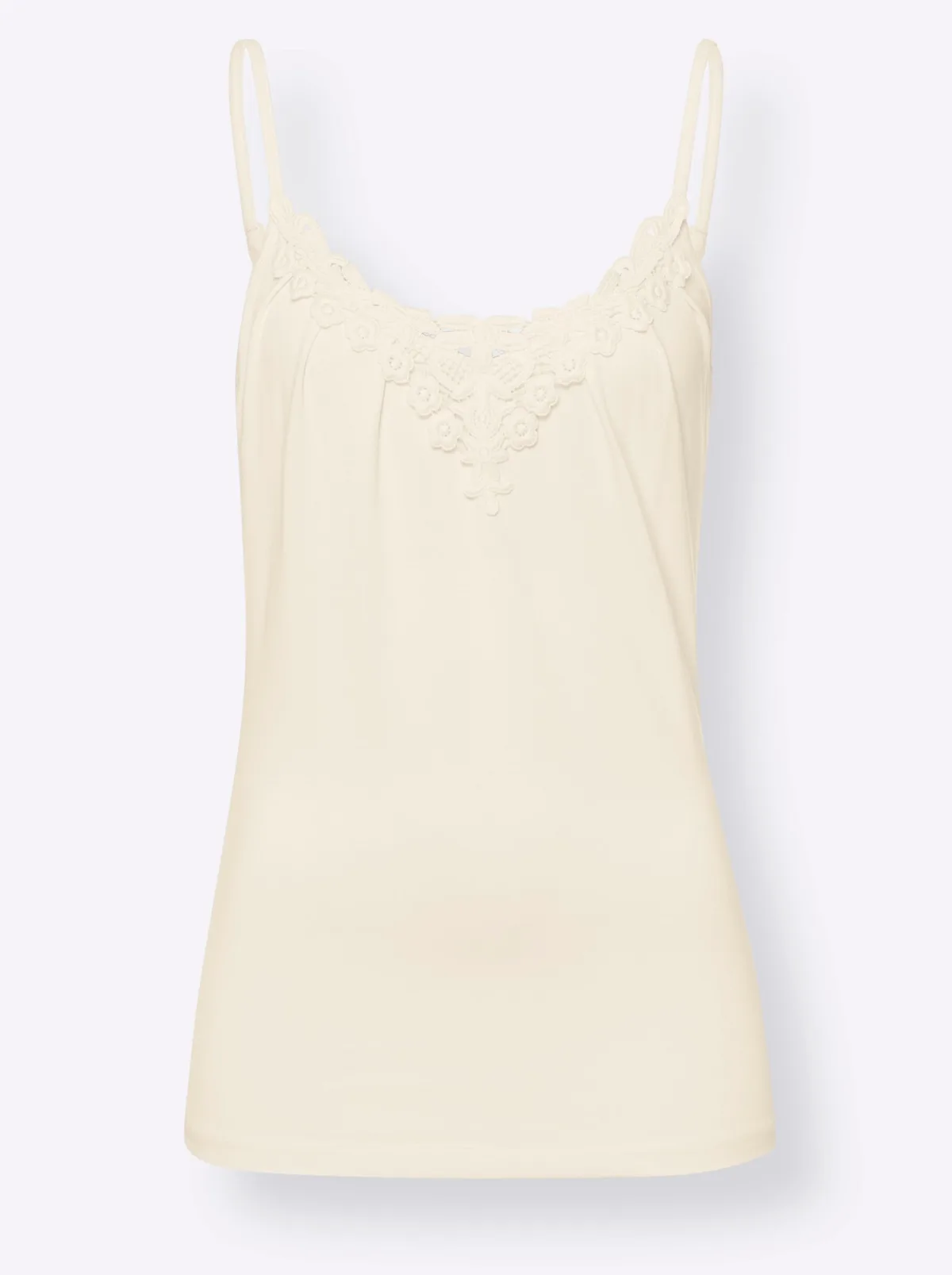 Design: Gevoerde zoom/rand; Materiaal: Jersey; Halstype: V-hals; Motief: Effen; Soort bandjes: Spaghettibandjes; Details: Kant, Plooien; Extra's: Verstelbare bandjes; Pasvorm: Normale pasvorm; Armlengte: Mouwloos; Lengte: Normale lengte