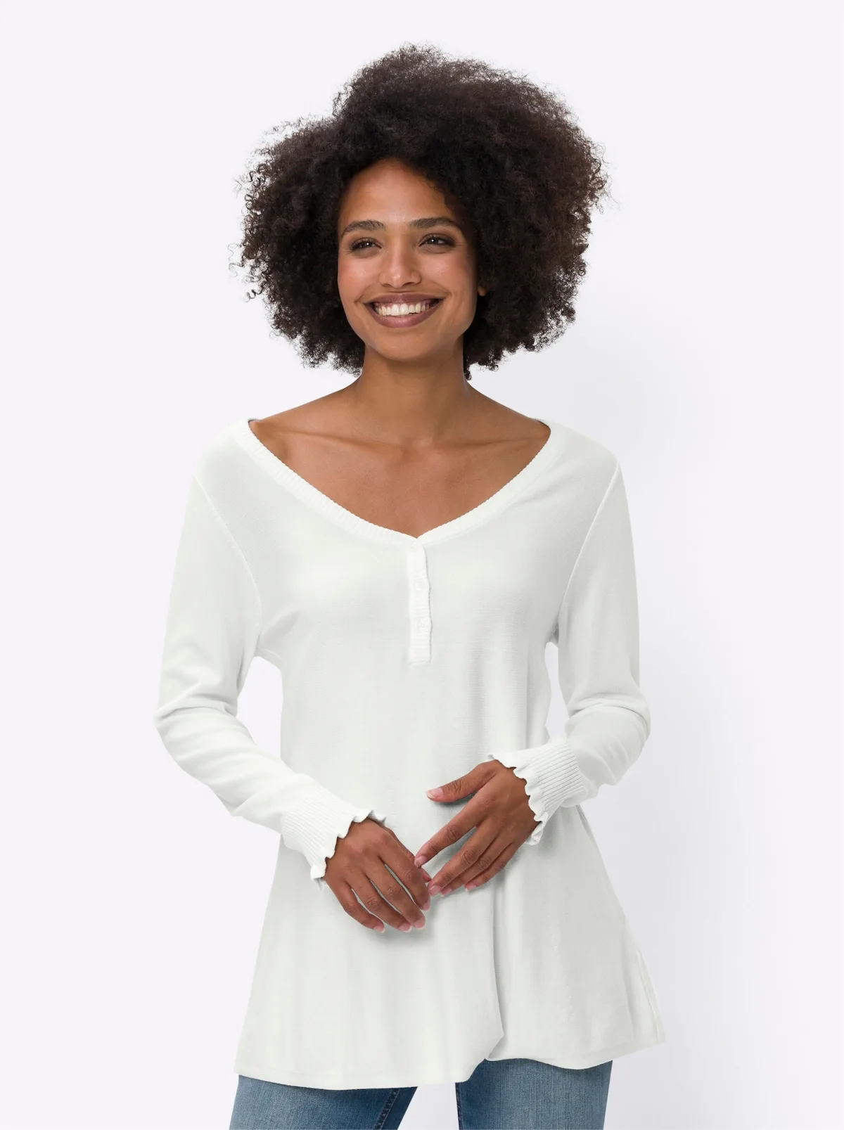 Design: Geribd ceintuurtje, Geschulpte zoom; Type sluiting: Gesloten; Materiaal: Viscose; Halstype: V-hals; Motief: Effen; Details: Volant; Extra's: Patroon gebreid, Gladde stof; Pasvorm: Aansluitende pasvorm; Armlengte: Lange mouw; Lengte: Lange pasvorm