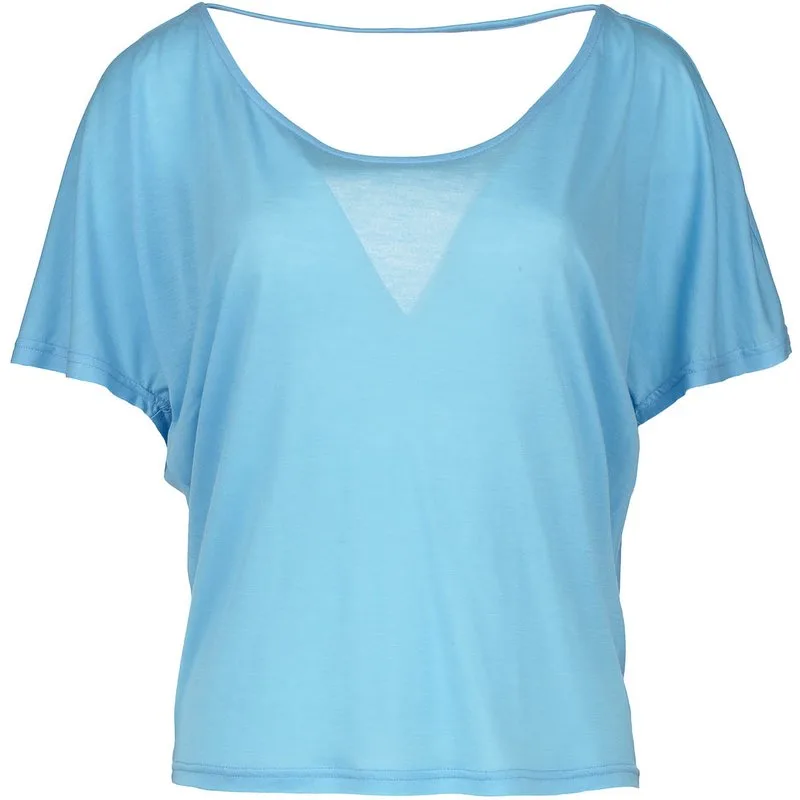 Deze hemelsblauwe zomertop is gemaakt van tencelstof. Het heeft een boothals en korte vleermuismouwen. De gedrapeerde rug wordt vastgehouden met een strook bij de schouders. Het kledingstuk heeft een losse pasvorm en loopt taps toe naar de zoom. Afmetingen voor maat 36/S (in cm) zijn: Schouderbreedte-40, Buste-56, Taille-48, Zoomlijn-44, Mouwlengte - 18, Lichaamslengte-53.