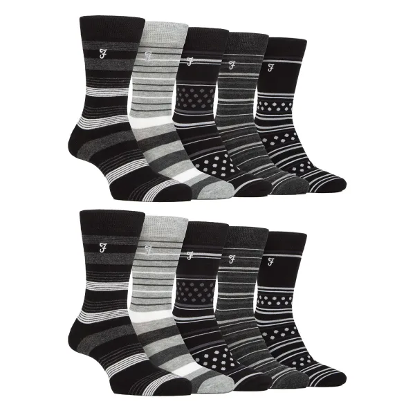 Farah - Heren 10 Paar Multi-Pack Felle Bamboosokken: Stap in een wereld van ongeëvenaard comfort en stijl met de Farah Heren Bamboofelle Sokken. Verwenn je voeten met de luxueuze zachtheid van bamboe, terwijl elke stap aanvoelt als lopen op wolken. Dit 10-paar bamboosokken voor heren is vervaardigd uit bamboe en biedt een pluche en zachte aanraking die je sokkenervaring naar een hoger niveau tillt. De unieke eigenschappen van bamboe gaan verder dan alleen zachtheid - deze sokken reguleren van nature de temperatuur, waardoor ze je in de winter warm houden en in de zomer een koele, ademende sensatie bieden. Maak je geen zorgen als de bloedsomloop een punt van zorg is! Het zachte gripontwerp van deze sokken bevordert de reguliere bloedsomloop en zorgt voor comfort gedurende de dag. Druk je individualiteit uit met meer dan 12 verschillende gestreepte, felle en effen gekleurde patronen. Verkrijgbaar in herenmaat 6-11 UK, zijn deze sokken zorgvuldig vervaardigd uit 69% Viscose (uit bamboe), 28% Polyester, 2% Elastodiene en 1% Elastaan voor een mix van zachtheid, duurzaamheid en flexibiliteit. Ze zijn machinewasbaar. Extra productdetails: Farah Heren Bamboosokken 10 Paar Waardepakket Superzachte Bamboe Vochtregulerende Gestreepte & Gekleurde Patronen Hand-gekoppelde Teennaden Zachte Zachte Grip Top Geweldig Voor Bloedsomloop Meer Dan 12 Stijlopties Herenmaat: 6-11 UK Machinewasbaar