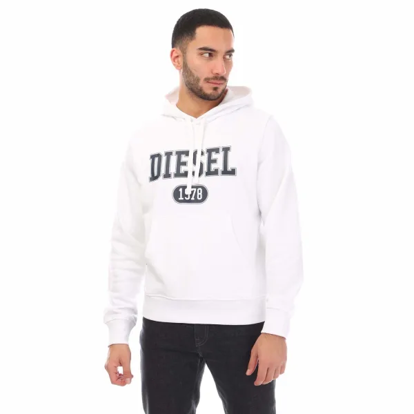 Mens Diesel S-Ginn 1-B Hoodie in white.- Sleek hooded.- Kangaroo pocket.- Ribbed cuffs and hem.- Printed logo on the front.- Regular fit.- 100% Cotton.- Ref: A16962RIAJH100