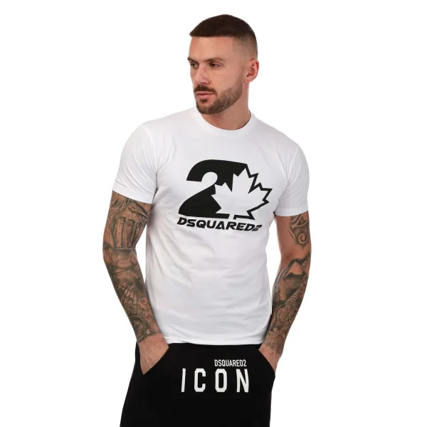 Mens Dsquared2 Maple Leaf Logo T-Shirt in white.- Ribbed crewneck.- Short sleeves.- Logo print to the front.- Straight hem.- Regular fit.- 100% Cotton.- Ref: S74GD1157100