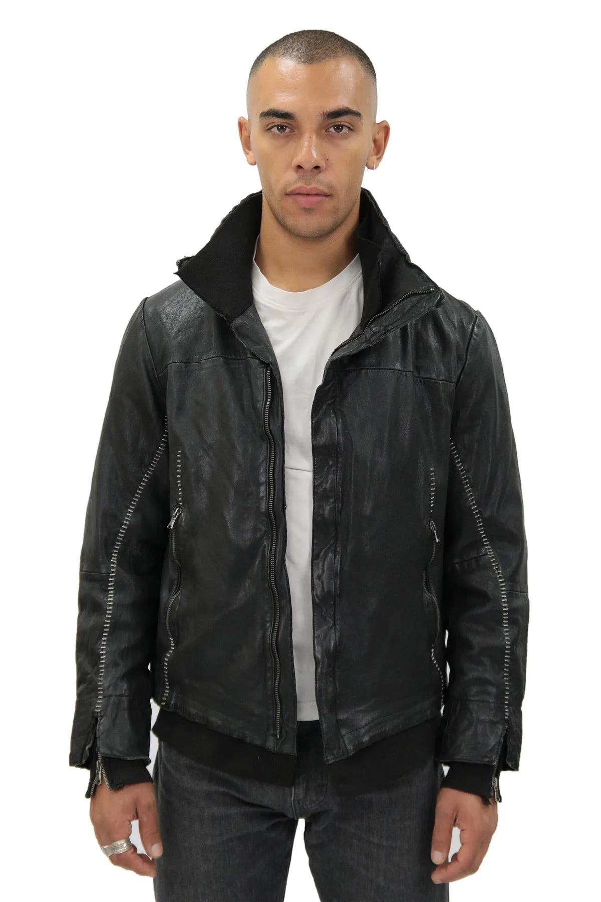 De kenmerkende kenmerken van deze jas zijn de witte, met de hand gestikte panelen, die een geweldige contrasterende look geven tegen de body van de jas, die verschijnt in onze premium zwarte kleurstelling. Andere fraaie toevoegingen zijn de klassieke dubbele kraag in overhemdstijl en de taps toelopende ribgebreide mouwen en taille die het slim-fit silhouet van het jasje complementeren. Deze jas heeft ook een verborgen ritssluiting over de volledige lengte aan de voorkant en zakken met ritssluiting in de taille voor opbergruimte. Over het geheel genomen is dit een gewaagd stuk met een eigen unieke en stijlvolle uitstraling. • 100% premium ultrazacht nappaleer. • Taillezakken met ritssluiting • Premium met de hand gestikte panelen • Slim fit ontwerp met taps toelopende taille en mouwen • Comfortabele ribgebreide binnenvoering