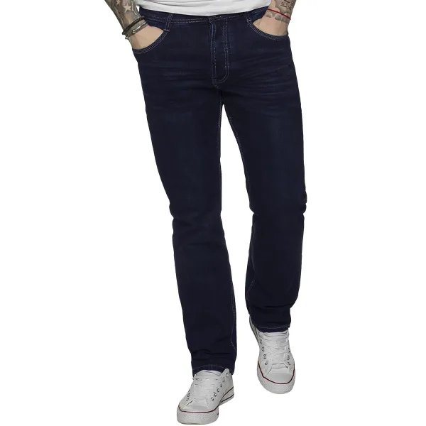 ETO heren stretchjeans met taps toelopende pasvorm voor vrijetijds- en werkkleding, knoopsluiting, contrasterende stiksels, merkknopen en klinknagels, voorzakken zijn vastgezet met klinknagels, ontwerp met 5 zakken, 98% katoen, 2% spandex, machinewasbaar (zie tags) .