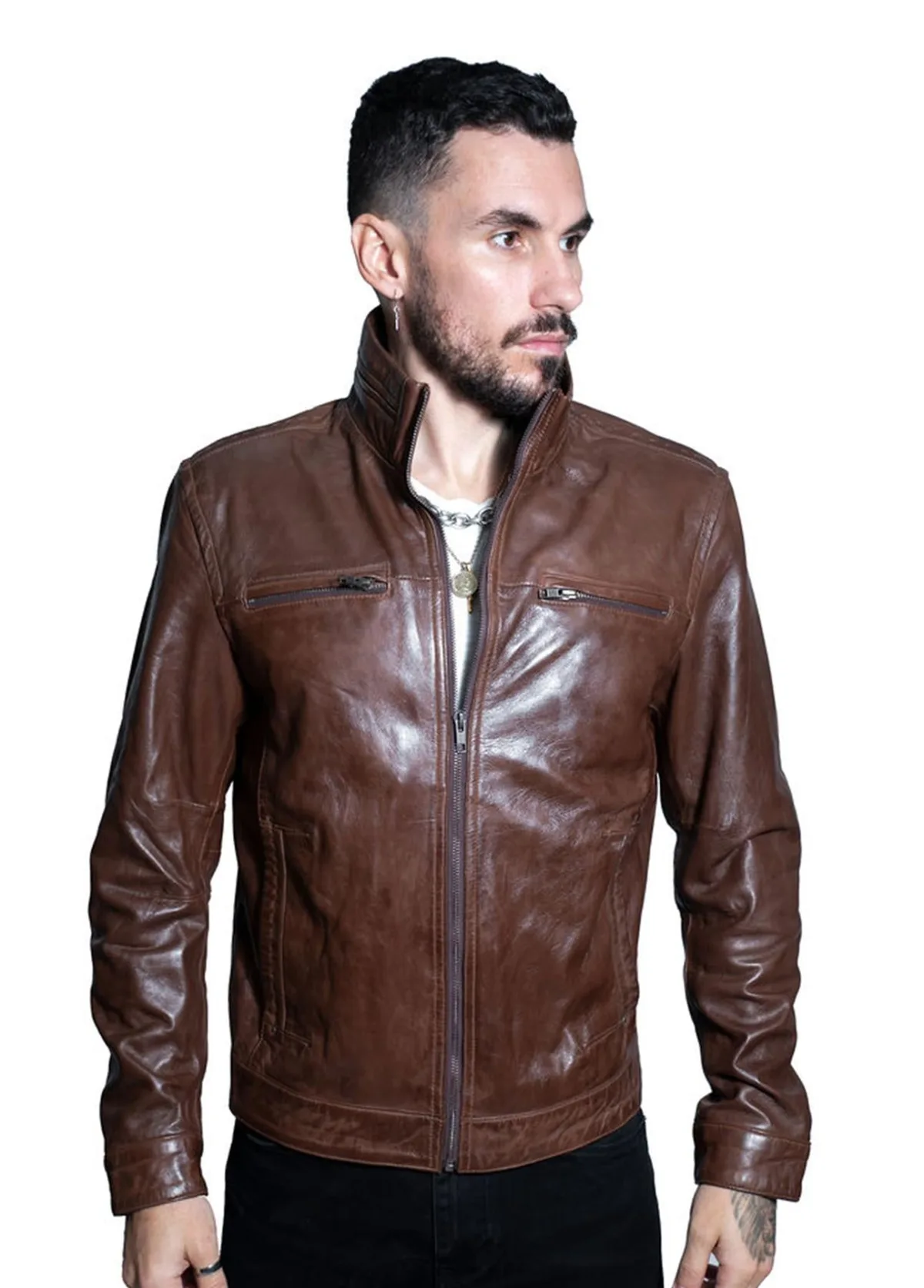 Dit jack is ontworpen in ons klassieke bikersilhouet en heeft een volledige opstaande kraag die kan worden geritst voor extra warmte of open kan worden gelaten om een overhemdstijl na te bootsen voor een meer casual look. Deze jas is gemaakt van ons premium volnerf nappaleer en voelt ultrazacht en kwalitatief aan, geholpen door de premium jasvoering met ribgebreide details in de kraag voor extra comfort. Twee verborgen zakken in de taille zorgen voor een strakke esthetiek, met nog twee zakken met ritssluiting over de borst in traditionele bikerstijl. Deze jas is verkrijgbaar in drie van onze meest iconische kleuren, waardoor er drie geweldige alternatieven zijn die bij verschillende outfits passen. • 100% premium ultrazacht nappaleer. • Verborgen zakken in de taille • Zakken met ritssluiting over de borst • YKK-rits over de volledige lengte aan de voorkant • Verkrijgbaar in lichtbruin, bruin en zwart