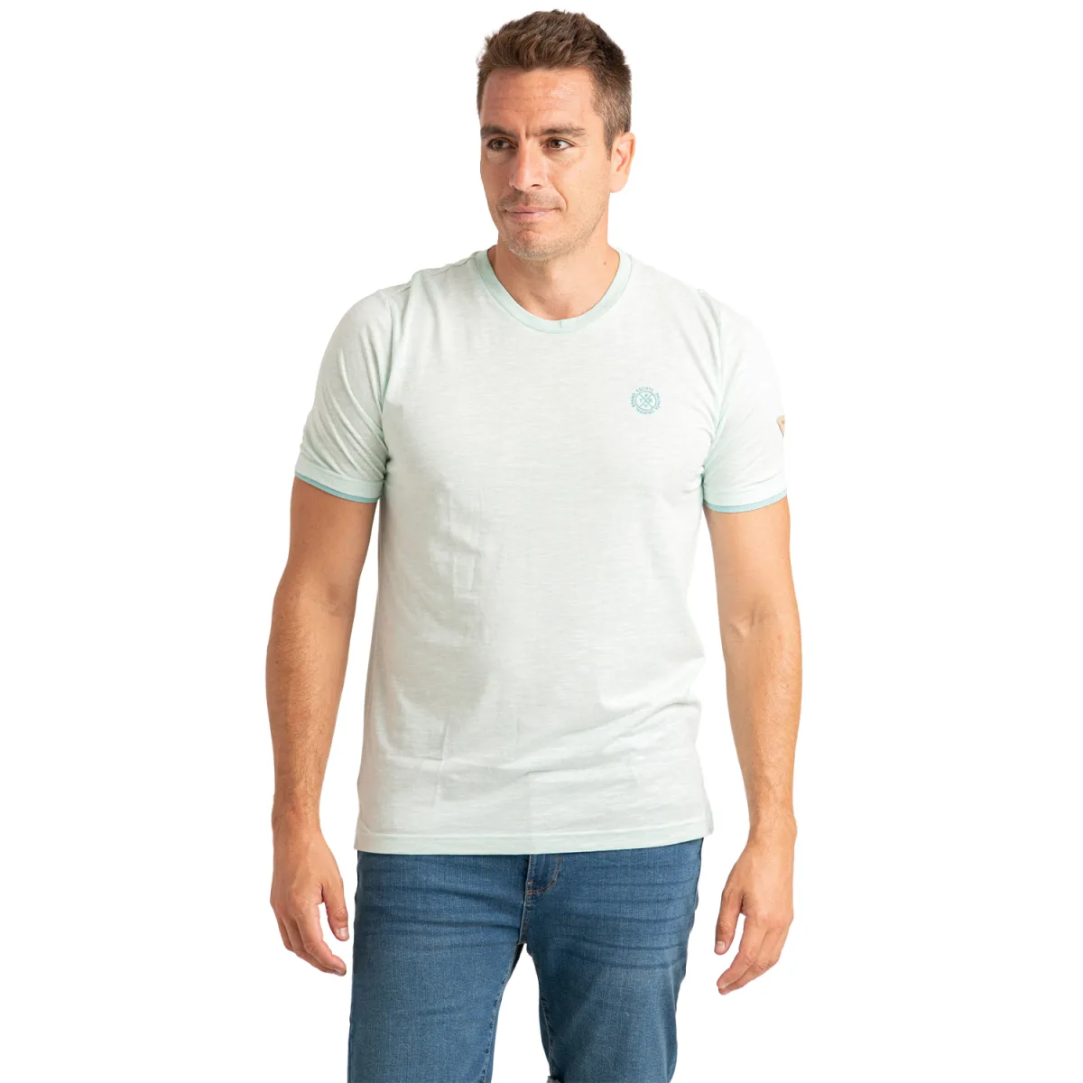 Heren T-shirt Privata gemaakt van microgestreept stof, een subtiele structuur die textuur, visuele diepte en een meer verfijnde afwerking biedt dan conventioneel effen stof. Het zachte, lichte en ademende gevoel maakt het een ideaal T-shirt met korte mouwen voor de hele dag comfort. Het heeft een minimalistisch grafisch detail op de borst, discreet en elegant, dat zijn identiteit versterkt zonder het ontwerp te overweldigen. De kraag en de mouwen hebben een ton-sur-ton rand, wat zorgt voor een schone en gepolijste afwerking die deze casual heren t-shirt kenmerkt. De regular fit past comfortabel bij de silhouet en biedt vrijheid van beweging en een uitgebalanceerde pasvorm. Makkelijk te combineren met jeans, chinos of shorts, perfect om moderne en veelzijdige casual herenlooks te creëren. Een basis heren t-shirt dat opvalt door zijn textuur, veelzijdigheid en eigentijdse stijl, een essentieel item in de mannenmode. Samenstelling: 50% Katoen, 50% Polyester Onderhoud: Wassen op maximaal 30ºC. Strijken op een lage temperatuur. Niet in de droger. Geen bleekmiddel gebruiken. Niet geschikt voor droge reiniging.
