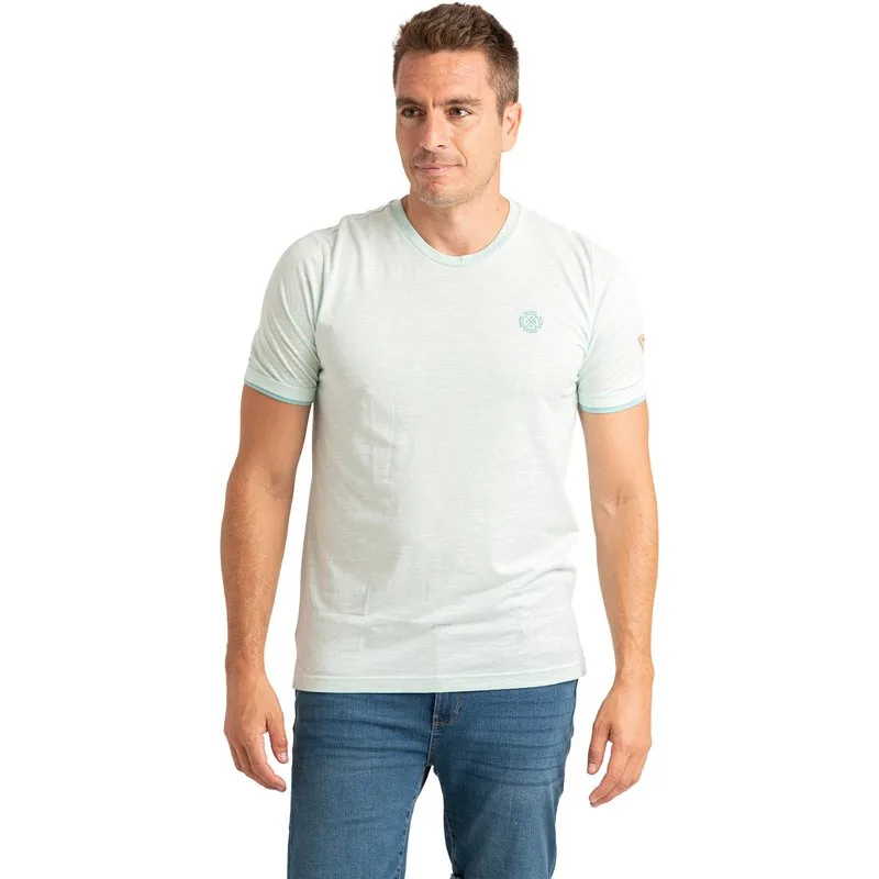 Heren T-shirt Privata gemaakt van microgestreept stof, een subtiele structuur die textuur, visuele diepte en een meer verfijnde afwerking biedt dan conventioneel effen stof. Het zachte, lichte en ademende gevoel maakt het een ideaal T-shirt met korte mouwen voor de hele dag comfort. Het heeft een minimalistisch grafisch detail op de borst, discreet en elegant, dat zijn identiteit versterkt zonder het ontwerp te overweldigen. De kraag en de mouwen hebben een ton-sur-ton rand, wat zorgt voor een schone en gepolijste afwerking die deze casual heren t-shirt kenmerkt. De regular fit past comfortabel bij de silhouet en biedt vrijheid van beweging en een uitgebalanceerde pasvorm. Makkelijk te combineren met jeans, chinos of shorts, perfect om moderne en veelzijdige casual herenlooks te creëren. Een basis heren t-shirt dat opvalt door zijn textuur, veelzijdigheid en eigentijdse stijl, een essentieel item in de mannenmode. Samenstelling: 50% Katoen, 50% Polyester Onderhoud: Wassen op maximaal 30ºC. Strijken op een lage temperatuur. Niet in de droger. Geen bleekmiddel gebruiken. Niet geschikt voor droge reiniging.