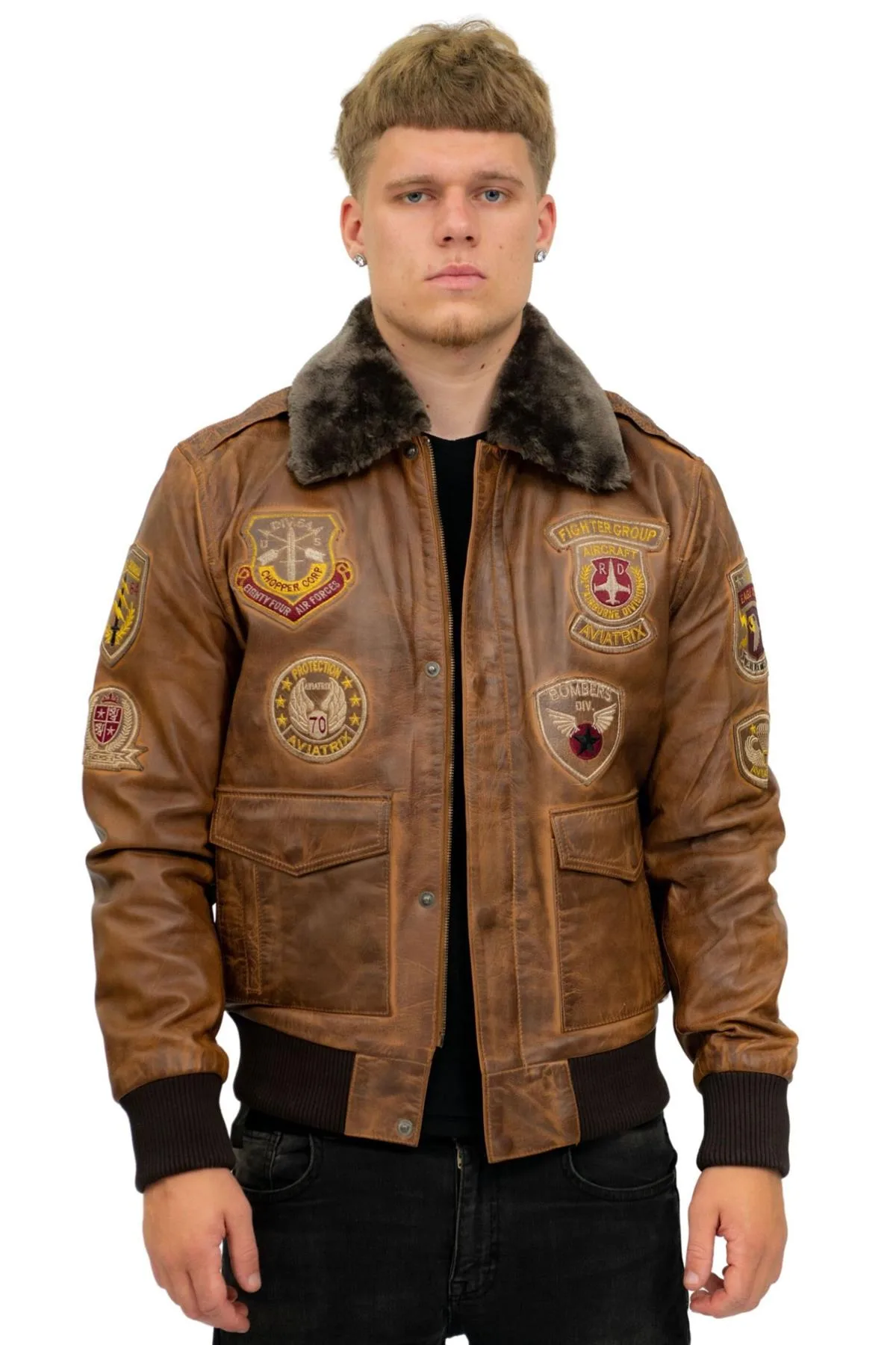 Stap in de wereld van de luchtvaart met ons bruin leren pilotenbomberjack voor heren, een waar eerbetoon aan de pilotenstijl, met een luchtmachtbadge en een tijdloos ontwerp. Dit jack is gemaakt van premium bruin leer en straalt verfijning en functionaliteit uit. Twee externe opgestikte heupzakken met zij-ingang bieden praktische en stijlvolle opbergmogelijkheden voor uw essentiële spullen. Versierd met in totaal acht geborduurde badges, die een vleugje authenticiteit en vintage charme toevoegen aan het ontwerp van de jas. Elastische manchetten en taille zorgen voor een comfortabele en veilige pasvorm, waardoor het klassieke pilotenbommenwerpersilhouet wordt benadrukt. De afneembare bontkraag zorgt voor veelzijdigheid, zodat je je look kunt aanpassen aan verschillende gelegenheden en weersomstandigheden. Met twee binnenzakken met ritssluiting en een binnenkant met wereldkaartvoering biedt dit pilotenbomberjack zowel stijl als gemak, waardoor het een must-have is voor zowel luchtvaartliefhebbers als avonturiers. Verhoog je stijl en omarm de geest van de luchtvaart met ons bruin leren pilotenbomberjack, ontworpen om zowel in de lucht als op de grond een krachtig statement te maken