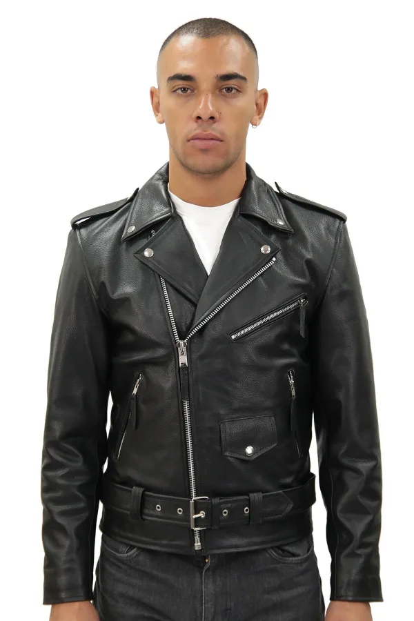 Dit klassieke bikerjack, een verfraaiing van de iconische cultuur uit de jaren 60, is gedrapeerd met kwastjes met franjes en heeft een YKK-ritssluiting met tag die zich uitstrekt over een voorkant met dubbele rij knopen. Handschoenmanchetten met ritssluiting, breed geplaatste revers en schouderepauletten dragen allemaal bij aan de stijlvolle aantrekkingskracht van dit klassieke, tijdloze stuk. Deze jas heeft ook een zak met rits en studs voor extra gemak, evenals een schuine zak met rits op de borst. De binnenkant van de jas heeft een aansluitende, gewatteerde binnenkant met twee zakken in de voering voor het opbergen van mobiele telefoons, portemonnees, kaarthouders etc. • Premium koeienhuid jas in de klassieke Brando-stijl • Kwasten franje aan de buitenkant • Handschoenmanchetten met ritssluiting • Comfortabel nauwsluitend ontwerp • Asymmetrisch YKK-ritssluiting aan de voorkant • Buitenvakken met drukknopen en ritssluiting • Verstelbare heupriem • Zakken geïntegreerd in de voering van de jas