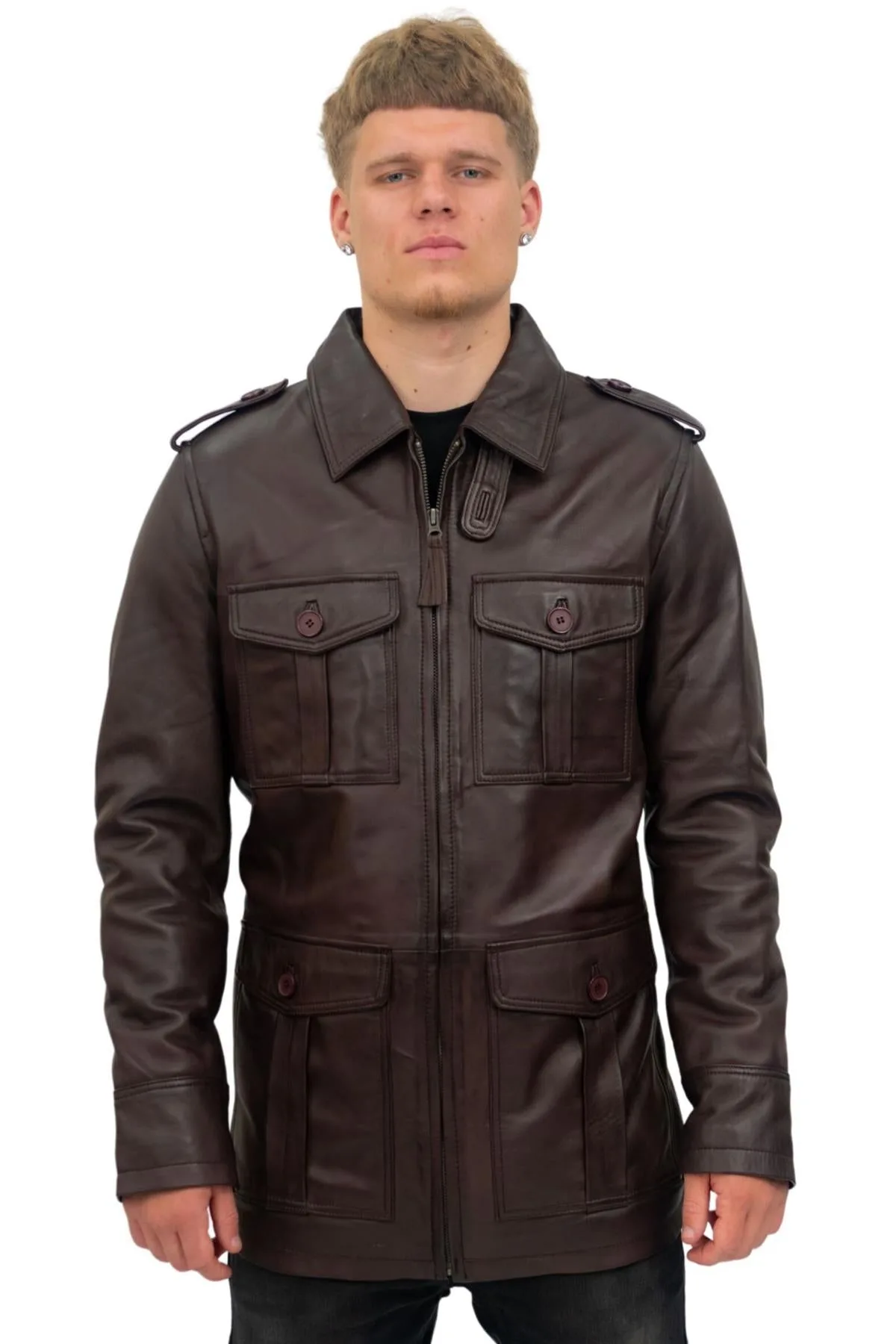 We gebruiken hier ons ultrazacht premium nappaleer om een jas te creëren die is geïnspireerd op de klassieke safaristijl die eind jaren '40 in de modewereld opdook. Deze stijl wordt gekenmerkt door klepzakken met knoopsluiting, waarvan er vier in de taille en borst van deze jas zitten, en bevat ook schouderepauletten die zijn geïnspireerd op traditionele militaire uniformen. De binnenkant van de jas is gevoerd met een popeline-stof die is versierd met een tonaal geruit patroon en is voorzien van drie geïntegreerde zakken, waarvan er twee zijn voorzien van een ritssluiting voor extra veiligheid. • 100% eersteklas ultrazacht nappaleer • Vier externe klepzakken • Kraag in overhemdstijl • Jas is gevoerd met geruite poplin-stof en is geïntegreerd met drie zakken • Retro safaristijlthema