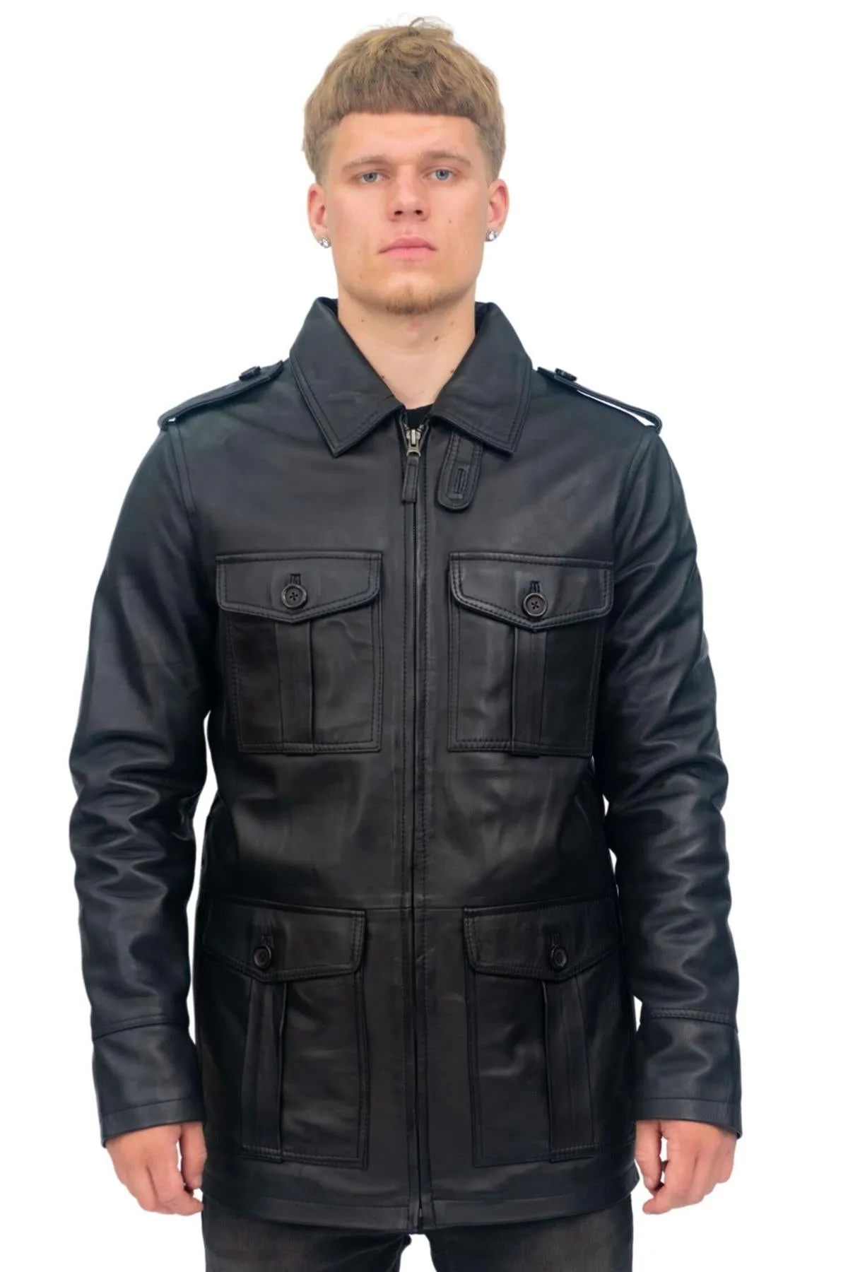We gebruiken hier ons ultrazacht premium nappaleer om een jas te creëren die is geïnspireerd op de klassieke safaristijl die eind jaren '40 in de modewereld opdook. Deze stijl wordt gekenmerkt door klepzakken met knoopsluiting, waarvan er vier in de taille en borst van deze jas zitten, en bevat ook schouderepauletten die zijn geïnspireerd op traditionele militaire uniformen. De binnenkant van de jas is gevoerd met een popeline-stof die is versierd met een tonaal geruit patroon en is voorzien van drie geïntegreerde zakken, waarvan er twee zijn voorzien van een ritssluiting voor extra veiligheid. • 100% eersteklas ultrazacht nappaleer • Vier externe klepzakken • Kraag in overhemdstijl • Jas is gevoerd met geruite poplin-stof en is geïntegreerd met drie zakken • Retro safaristijlthema