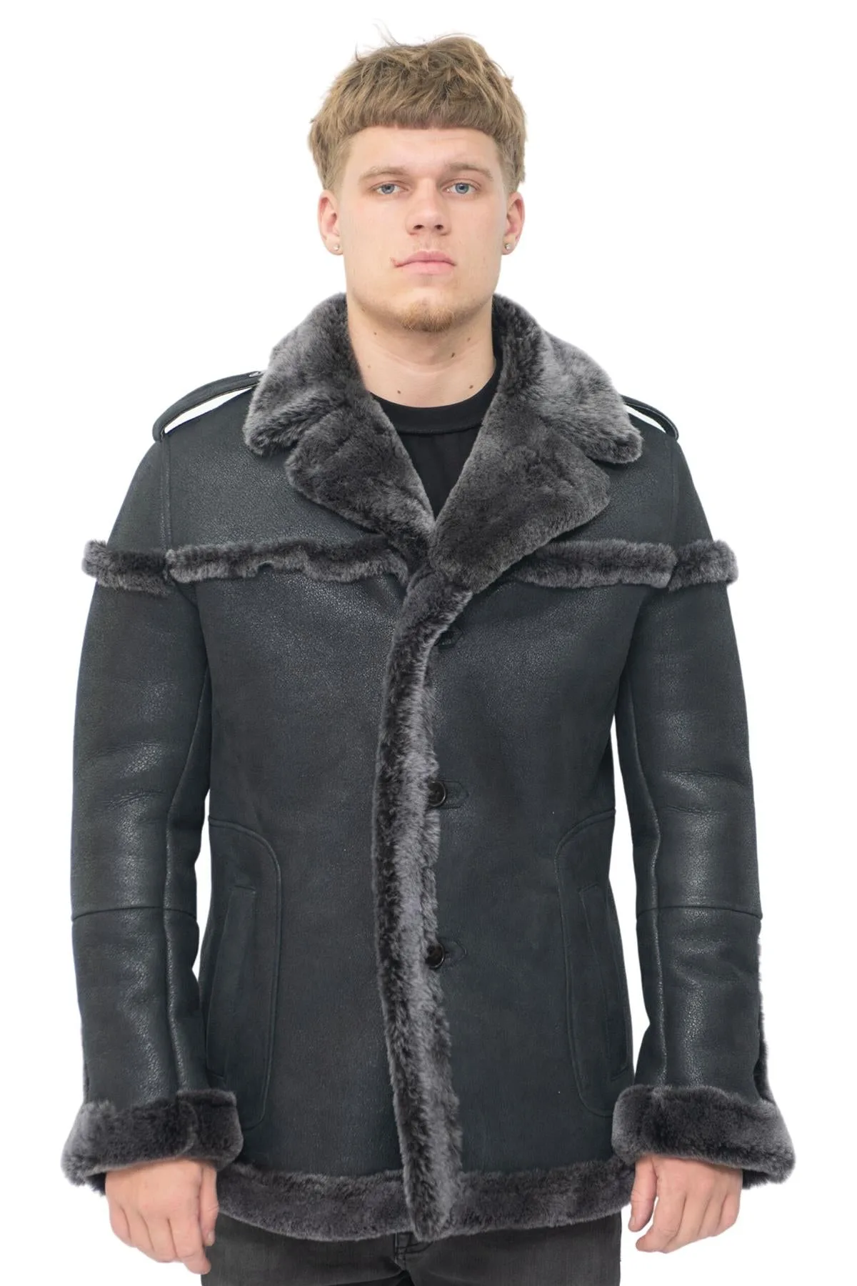 Dit stuk is liefdevol gedetailleerd door onze vakmensen om een elegante en unieke look te creëren die schittert in onze dubbelzijdige schapenvacht van Merino en is afgewerkt met een rijke zwarte suède. De voering van de jas staat bekend om zijn isolerende eigenschappen en is voorzien van lamswol, waardoor dit een uitstekende keuze is voor de winter. De voering verschijnt bij de taille, manchetten en bij de jasnaden om extra details toe te voegen en een mooi contrast te bieden met de gladde suède afwerking. De wollen voering is ook terug te vinden bij de brede kraag met inkeping en onderaan de knoopsluiting voor een uitbundige look. We hebben dit jasje ook voorzien van knopen op de manchetten voor extra verstelbaarheid en een tailleriem die karakter aan dit kledingstuk toevoegt en dient om extra maatwerk toe te voegen om een taps toelopende look bij de taille te creëren. • Gemaakt van hoogwaardige dubbelzijdige merinoschapenvacht • Dikke schapenvachtvoering staat bekend om zijn warmte en comfort • Voorzien van een verstelbare tailleriem, schouderepauletten en twee heupzakken • Voorzien van een traditionele sluiting met drie knopen