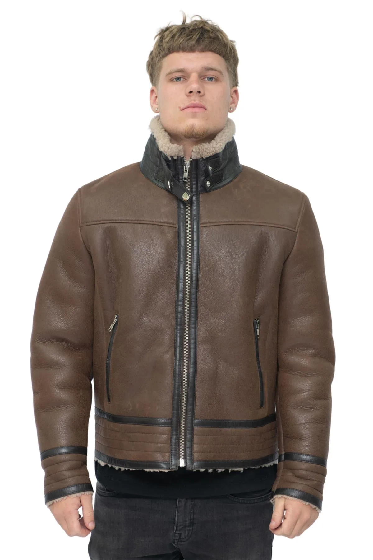 Deze jas is gemaakt van onze dubbelzijdige schapenvacht en wordt gekenmerkt door zwarte accenten rond de ritsen en de gewatteerde inzetstukken op de taille en manchetten, wat een geweldige opvallende stijl toevoegt in combinatie met de bruine kleurstelling waarin deze jas voorkomt. De binnenkant is voorzien van onze De fijnste dikke voering van schapenvacht, die net zo comfortabel is als de jas, is stijlvol en is een bijzonder goede keuze voor de winter vanwege het natuurlijke vermogen om lichaamswarmte vast te houden en u zo warm mogelijk te houden. Deze jas heeft een YKK-rits over de volledige lengte die open kan worden gelaten om de kraag in overhemdstijl te laten verschijnen, of volledig kan worden geritst en vastgemaakt met een riem met gesp voor extra bescherming tegen de kou. • Gemaakt van hoogwaardige dubbelzijdige schapenvacht • Dikke schapenvachtvoering staat bekend om zijn warmte en comfort • Voorzien van twee schuine zakken met ritssluiting en doorgestikte manchetten en taille • Voorzien van een metalen YKK-ritssluiting over de volledige lengte