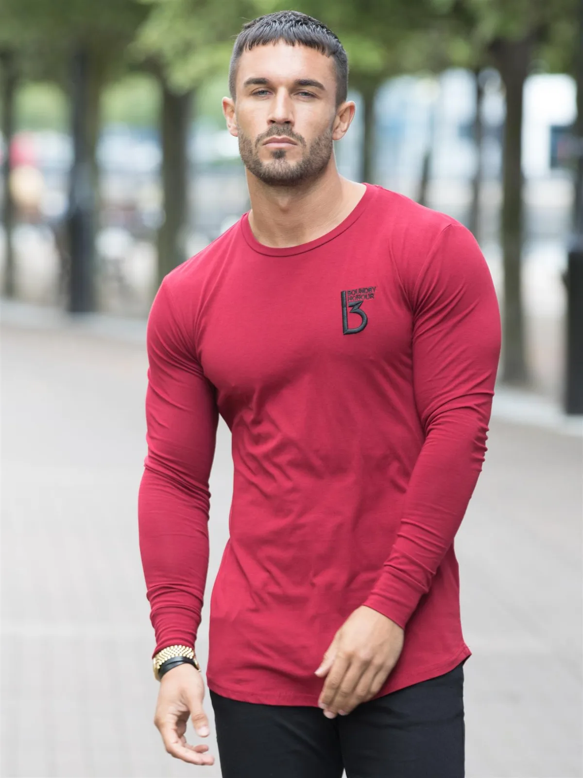 Herenontwerper, ronde hals, T-shirt met lange mouwen, aansluitende pasvorm, gebogen zoom. Borduursel op de borst. Mag in de wasmachine.