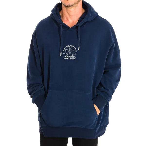 Hoodie La Martina. Navy kleur Geschikt voor meer informele looks, maar het blijft veelzijdig, zelfs om meer formele outfits te moderniseren. Bijpassende capuchon met trekkoord. Geborduurd logo op de voorkant. Graphics op de capuchon en achterkant met merkmotieven. Geribde manchetten en zoom. Kangoeroezak op de voorkant. Naden in toon zichtbaar. Samenstelling: 100% katoen. - Maximaal wassen op 30ºC. - Strijken op gemiddelde temperatuur, max. 110ºC. - Het gebruik van een droger is niet toegestaan. - Niet bleken. - Mag niet chemisch gereinigd worden. Samenstelling: 100% katoen. Onderhoud: - Maximaal wassen op 30ºC. - Strijken op gemiddelde temperatuur, max. 110ºC. - Droger is niet toegestaan. - Geen bleekmiddel gebruiken. - Kan niet chemisch gereinigd worden.