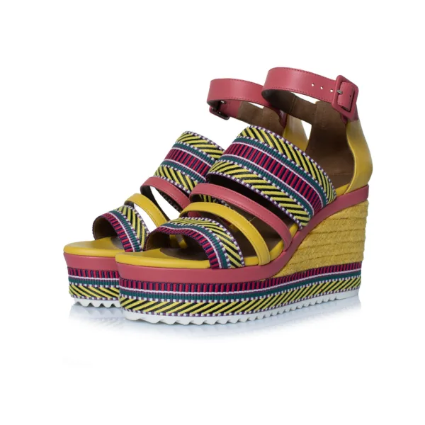 Aanbevolen verkoopprijs STAAT: zeer goede staat MAAT: 39 BINNENZOOLAFMETINGEN: 25 cm HAKOMVATTING: 10 cm PLATFORM: 4,5 cm MATERIAAL: leer, canvas KLEUR: multicolor ARTIKELNUMMER: 9584
