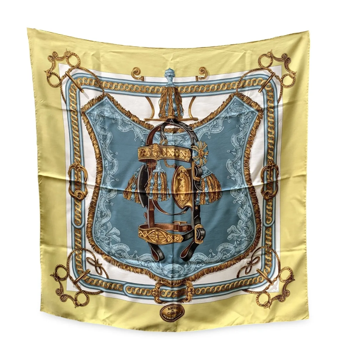VINTAGE, RRP ALS NIEUW Een tijdloos symbool van ruiterlijkheid, deze Hermès zijden sjaal is de iconische 'Bride de Cour', oorspronkelijk ontworpen door Françoise de la Perrière in 1969. Rijk aan koninklijke details en geïnspireerd door sierlijke paardenhoofdstellen, is dit ontwerp een van de meest geliefde klassiekers van het huis geworden - zo gekoesterd, in feite, dat het talloze keren opnieuw is uitgebracht in verschillende kleurstellingen, stoffen en formaten. Dit specifieke stuk is vervaardigd met de luxueuze ambachtelijkheid waar Hermès om bekend staat: 100% zijde met handgerolde randen en royale afmetingen van ongeveer 35 x 35 inch. De onmiskenbare 'HERMÈS - PARIJS' inscriptie is gedrukt in het lagere midden, waardoor het kunstwerk is verankerd in erfgoed en identiteit. Of het nu gedragen, ingelijst of verzameld wordt, 'Bride de Cour' is meer dan een sjaal - het is een stukje Hermès geschiedenis, geweven met de kunstzinnigheid van de Franse traditie. Conditiewaardering: A - UITSTEKEND Conditiedetails: Enkele losse draadjes op de zijde door normaal gebruik. Een paar microvlekken door normaal gebruik. Controleer de foto's zorgvuldig en vraag als je meer details nodig hebt of als je twijfels hebt. Doos?: Ja Afmetingen: lengte: 889 mm hoogte: 889 mm