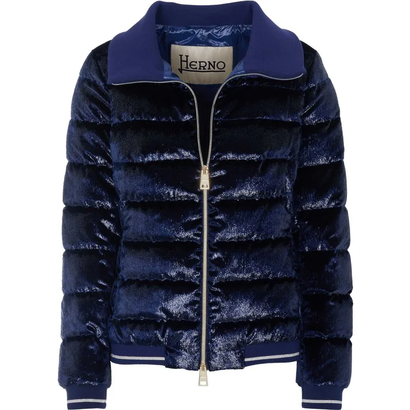 100% polyester; Herno-jas; Model: PI1329D15019 9251; Hoogwaardige afwerking; opstaande kraag; tweewegritssluiting; Twee zijzakken met ritssluiting; donsvoering; Glanzende fluwelen stof; Herno-logodetails