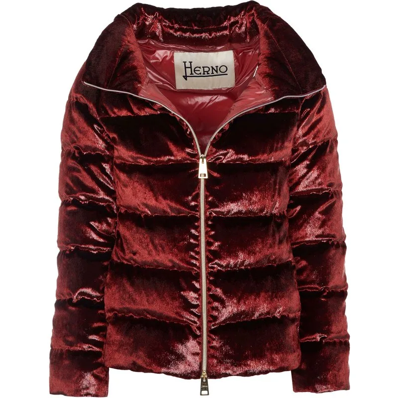 100% polyester; Herno-jas; Model: PI1318D15019 5980; Hoogwaardige afwerking; opstaande kraag; tweewegritssluiting; Twee zijzakken; Goudkleurige metalen details; donsvoering; Glanzende fluwelen stof; Herno-logodetails
