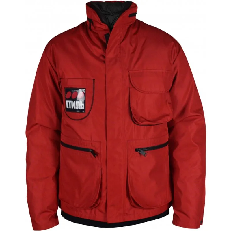 Heron Preston rood donsjack met een capuchon verborgen in de kraag.Hoge kraag.Sluit met een ritssluiting, drukknopen en klittenbandsluiting.Zwarte, rode en witte grafische print op de voorkant.Het heeft 2 zakken met ritssluiting en 2 zakken met klittenband aan de voorkant.Afneembare zwarte voering en lange mouwen.