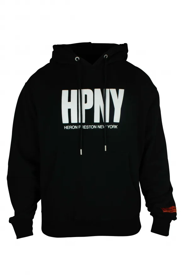 Heron Preston sweatshirt met capuchon van zwart katoen.Witte 'HPNY'-logoprint op de voorkant.Logopatch op de mouw.Capuchon met trekkoord.Kangoeroezak aan de voorkant.Lange mouwen.Geribbelde randen.100% katoen.