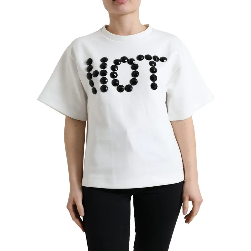 Verhoog, schitter, definieer je stijl met dit chique Dolce & Gabbana T-shirt. Het upgrade direct je casual garderobe met een vleugje designer flair. Gemaakt van een comfortabele katoenmix, biedt het een zachte, ademende feel tegen je huid. De klassieke ronde hals omlijst je gezicht prachtig, terwijl het opvallende 'HOT'-motief, gespeld met sprankelende zwarte rhinestones, een opvallend en uniek design toevoegt. Geniet van comfort de hele dag en moeiteloze stijl. De onderhoudsvriendelijke constructie zorgt voor een lange levensduur en eenvoudig machinewassen, waardoor het perfect is voor een statement tijdens casual uitjes of het toevoegen van een chique rand aan je dagelijkse look.