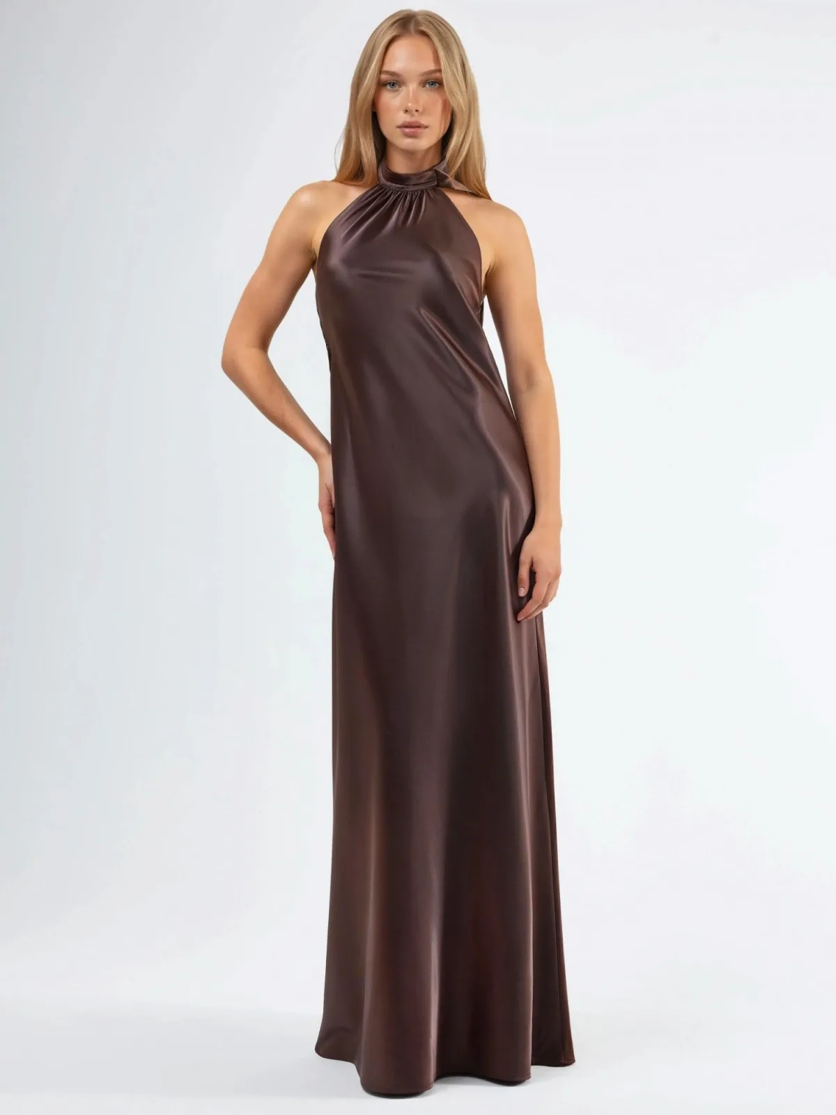 Design: Amerikaanse schouder, Keyholesluiting, Om te knopen/binden; Type sluiting: Knoopsluiting; Materiaal: Satijn; Halstype: Opstaande kraag; Motief: Effen; Soort bandjes: Haltermodel; Details: Gedrapeerd, Backless; Extra's: Op staal naden, Gladde stof; Lengte: Lang/maxi; Snit: Getailleerd; Pasvorm: Normale pasvorm; Armlengte: Mouwloos