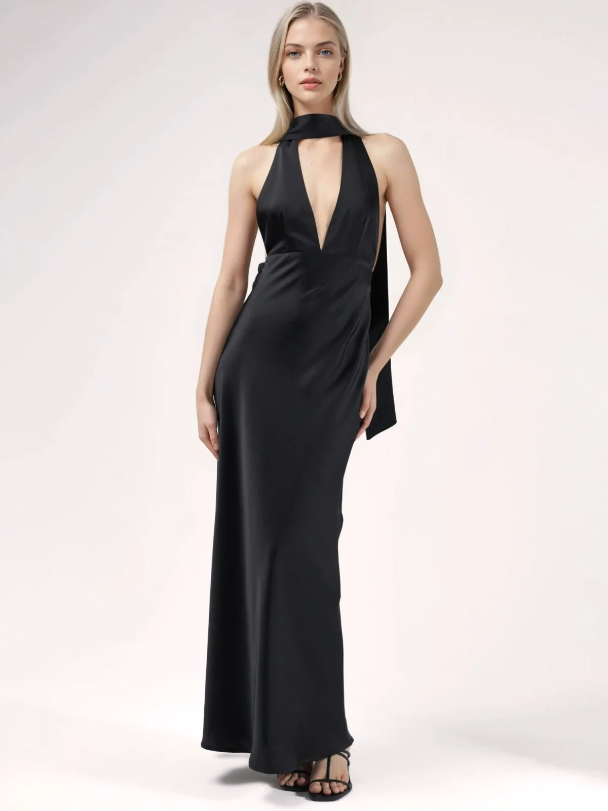 Design: Diepe snit/decolleté, Om te knopen/binden; Materiaal: Satijn; Halstype: V-hals; Motief: Effen; Soort bandjes: Haltermodel; Details: Backless; Extra's: Gladde stof; Lengte: Lang/maxi; Pasvorm: Slanke pasvorm; Armlengte: Mouwloos