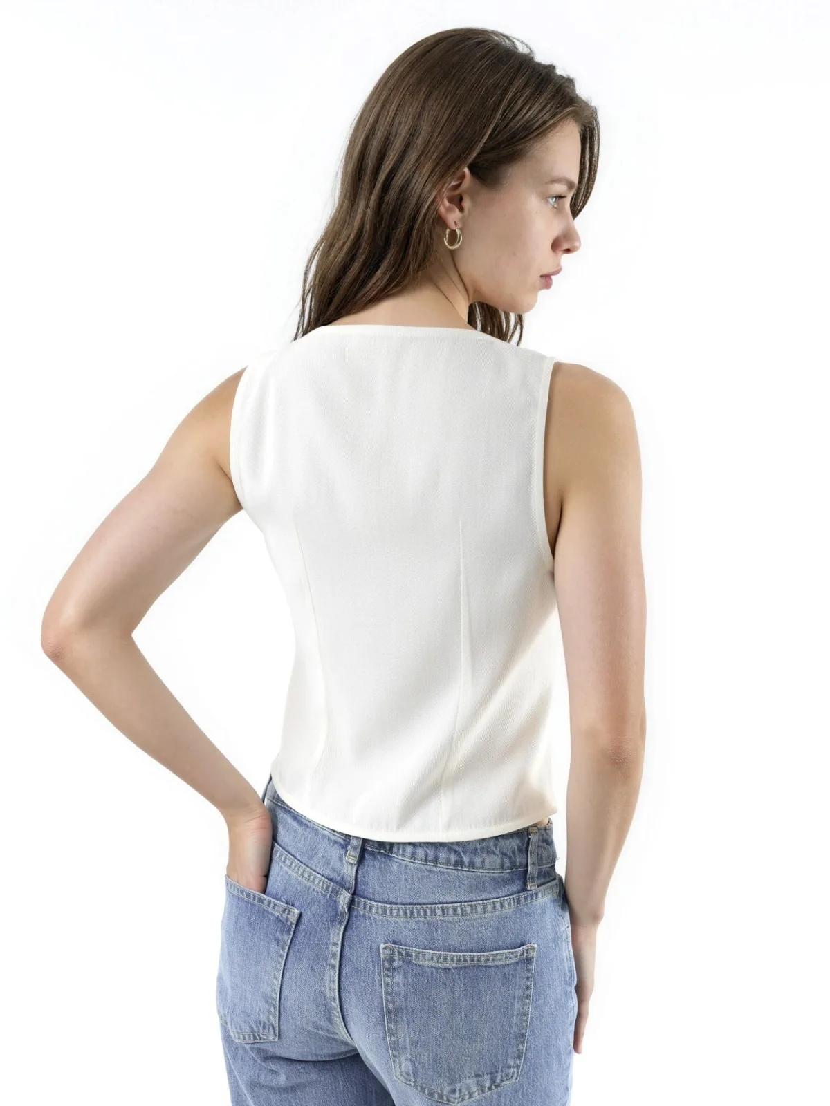 Blouse type: Klassieke blouse; Design: Knop placket; Type sluiting: Knoopsluiting; Halstype: Ronde hals; Motief: Effen; Kraag: Zonder kraag; Soort bandjes: Brede bandjes; Extra's: Op staal naden; Pasvorm: Slanke pasvorm; Armlengte: Mouwloos; Lengte: Normale lengte