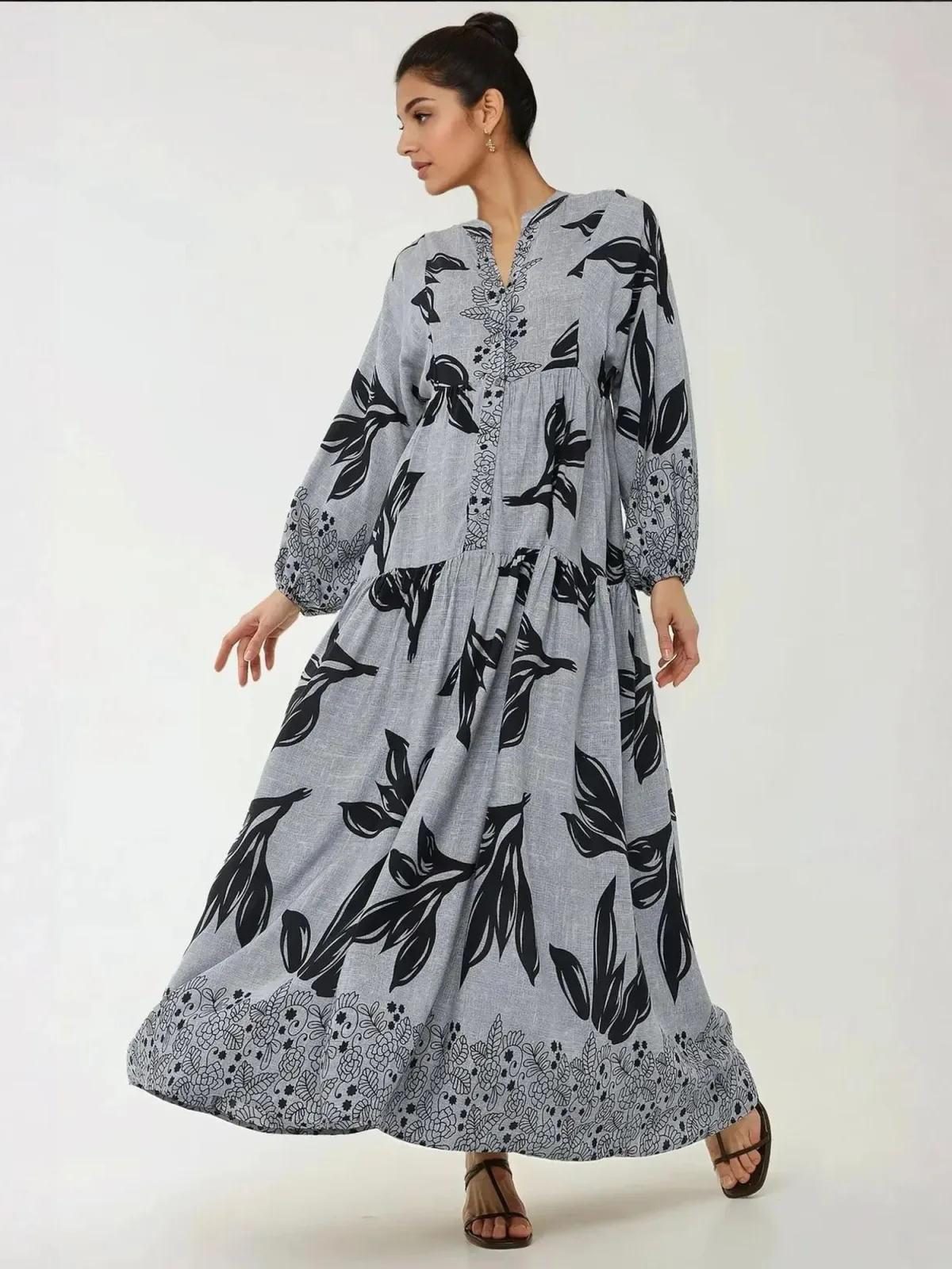 Design: Pofmouwen; Type sluiting: Knoopsluiting; Materiaal: Viscose; Halstype: Uitgesneden hals; Motief: Bloemenprint; Kraag: Tuniek kraag; Details: Volant, Gedrapeerd; Extra's: All-over patroon; Lengte: Lang/maxi; Snit: Uitlopend; Pasvorm: Losse pasvorm; Armlengte: Lange mouw