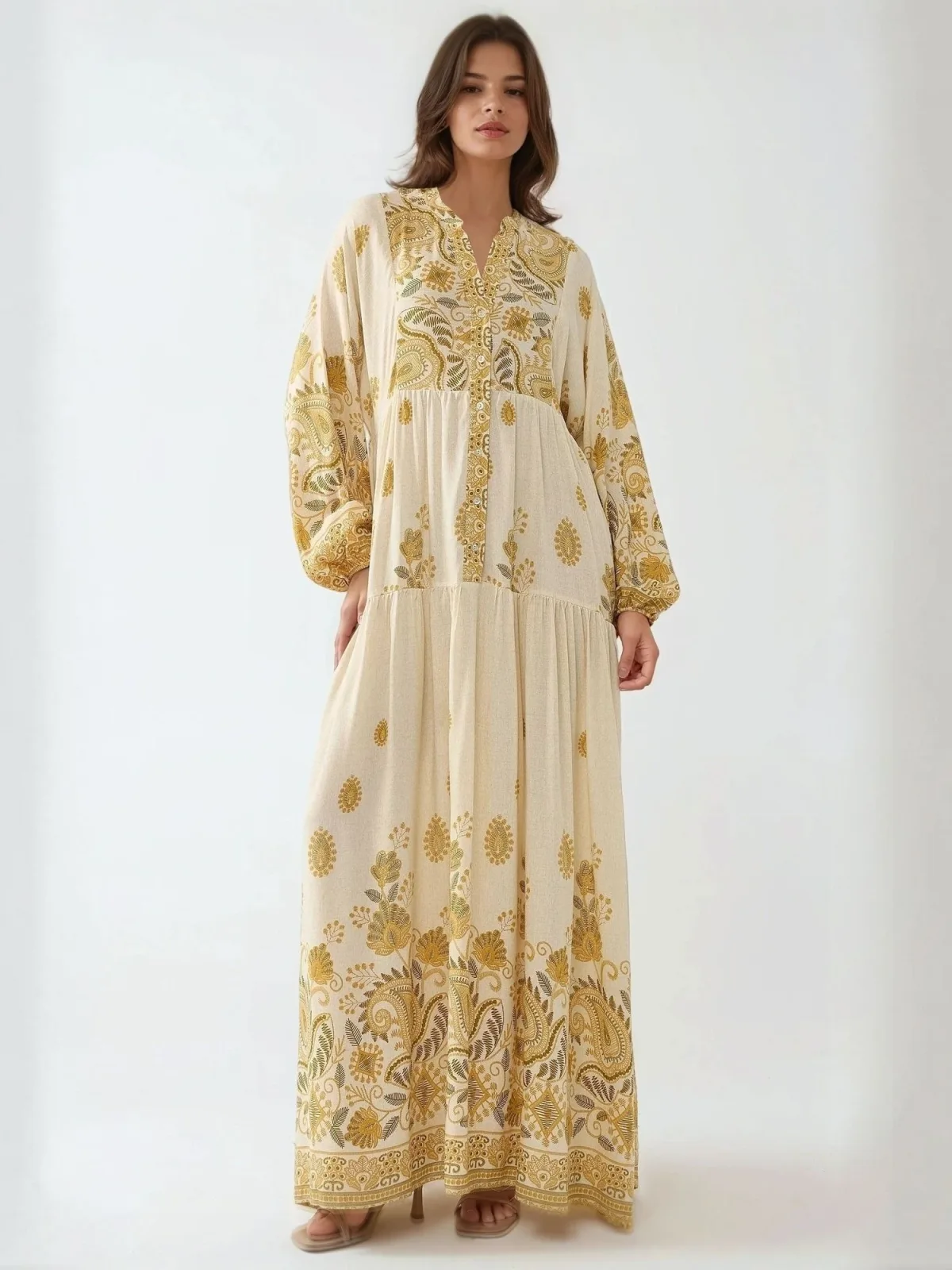 Design: Knop placket; Type sluiting: Knoopsluiting; Materiaal: Viscose; Halstype: V-hals; Motief: Paisley; Kraag: Tuniek kraag; Details: Volant, Gedrapeerd; Extra's: All-over patroon; Lengte: Lang/maxi; Snit: Uitlopend; Pasvorm: Losse pasvorm; Armlengte: Lange mouw