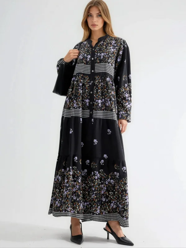 Design: Gevoerde zoom/rand, Knop placket, Pofmouwen, Overcut schouder; Type sluiting: Knoopsluiting; Materiaal: Viscose; Motief: Bloemenprint; Kraag: Tuniek kraag; Details: Volant, Gedrapeerd; Extra's: All-over patroon, Gladde stof; Lengte: Lang/maxi; Snit: Uitlopend; Pasvorm: Losse pasvorm; Armlengte: Lange mouw