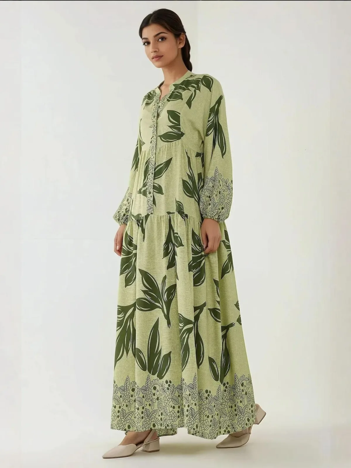 Design: Elastische taille/zoom; Type sluiting: Knoopsluiting; Materiaal: Viscose; Halstype: Uitgesneden hals; Motief: Bloemenprint; Kraag: Tuniek kraag; Details: Volant, Gedrapeerd; Extra's: All-over patroon; Lengte: Lang/maxi; Snit: Uitlopend; Pasvorm: Losse pasvorm; Armlengte: Lange mouw