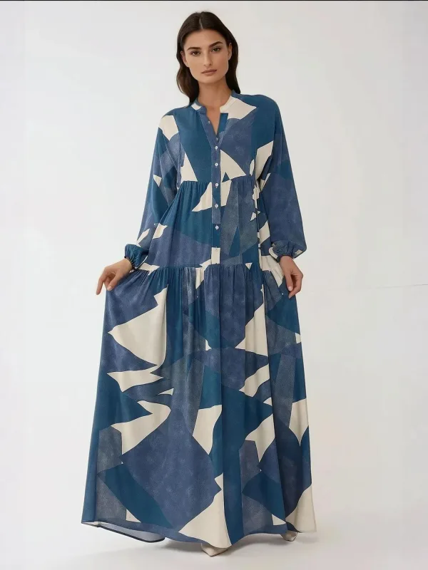 Design: Knop placket; Type sluiting: Knoopsluiting; Materiaal: Viscose; Halstype: V-hals; Motief: Color-Blocking; Kraag: Tuniek kraag; Details: Volant, Gedrapeerd; Extra's: All-over patroon; Lengte: Lang/maxi; Snit: Uitlopend; Pasvorm: Losse pasvorm; Armlengte: Lange mouw