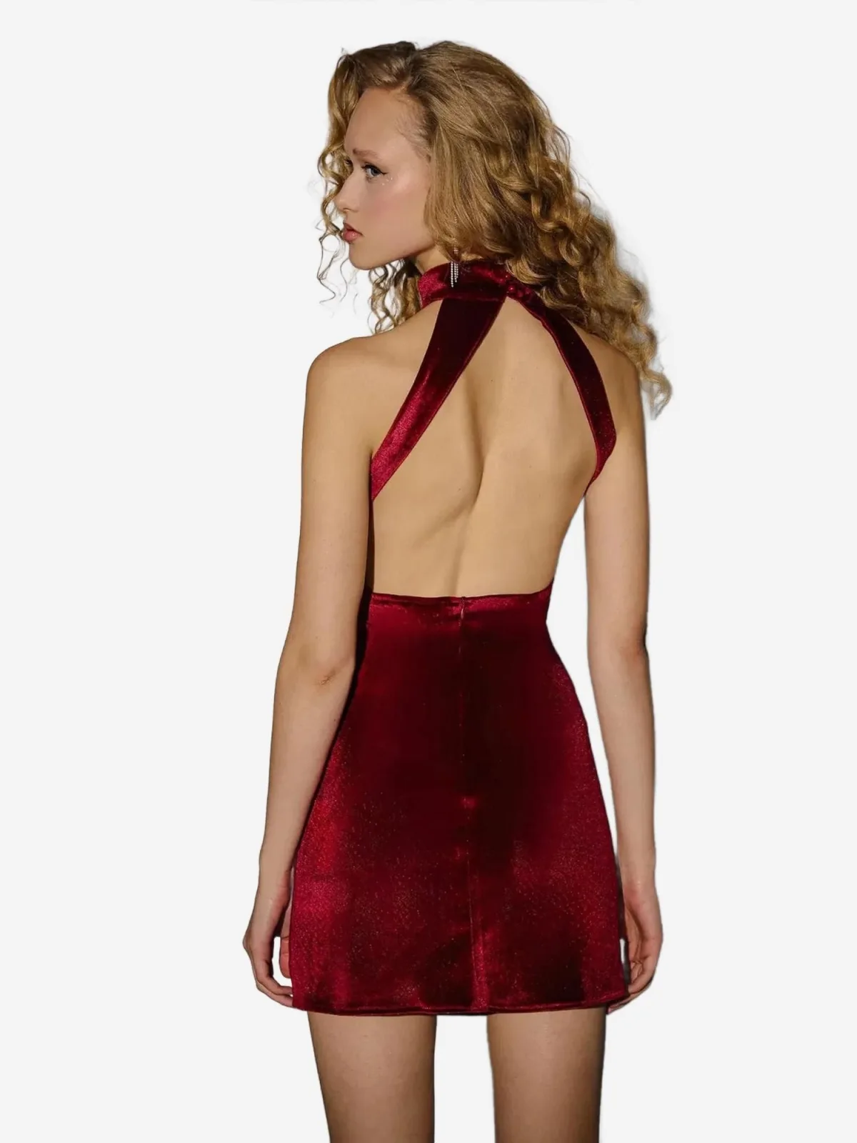 Design: Gevoerde zoom/rand, Rug rits; Type sluiting: Ritssluiting; Materiaal: Fluweel/Nicky Velours; Halstype: Opstaande kraag; Motief: Effen; Soort bandjes: Haltermodel; Details: Backless; Extra's: Voelt zacht aan; Lengte: Kort/mini; Snit: Figuur omarmend; Pasvorm: Aansluitende pasvorm; Armlengte: Mouwloos