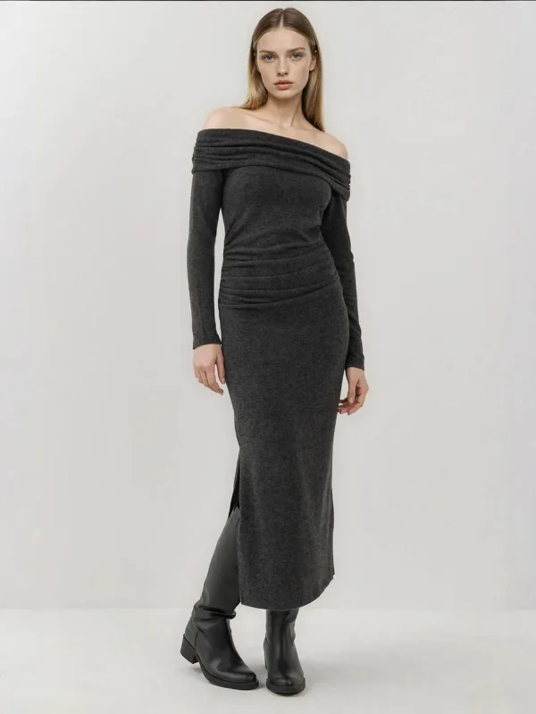 Design: Rechte zoom, Strapless/off-shoulder; Materiaal: Knitwear; Halstype: Carmen hals; Motief: Mélange; Details: Gedrapeerd; Extra's: Met textuur; Lengte: 7/8 lengte; Snit: Getailleerd; Pasvorm: Slanke pasvorm; Armlengte: Lange mouw