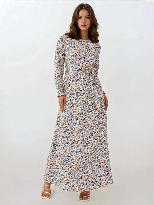Design: Gevoerde zoom/rand; Halstype: Ronde hals; Motief: Bloemenprint; Details: Gedrapeerd; Extra's: All-over patroon; Lengte: Lang/maxi; Snit: Getailleerd; Pasvorm: Normale pasvorm; Armlengte: Lange mouw