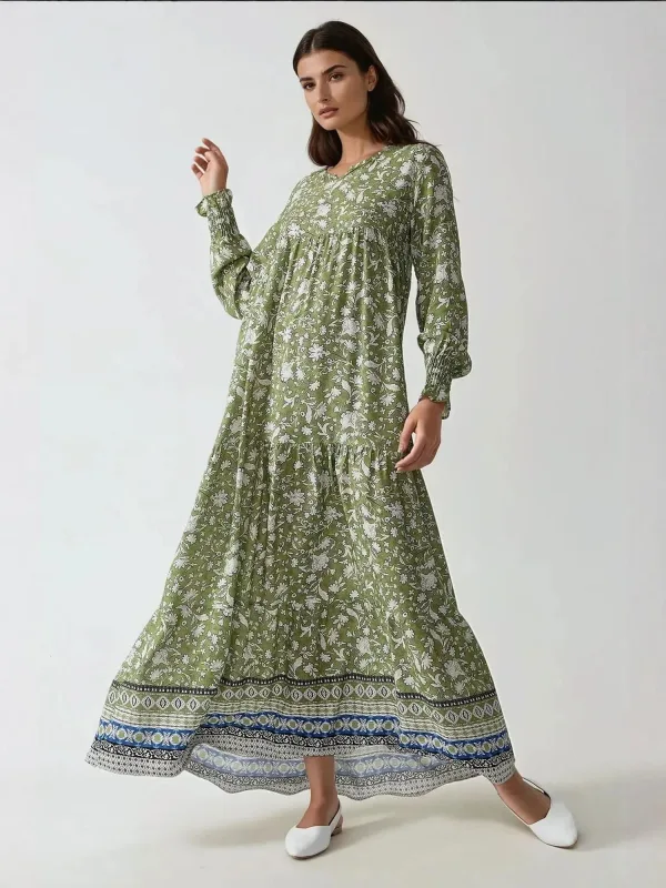 Design: Gevoerde zoom/rand, Rechte zoom; Materiaal: Viscose; Halstype: V-hals; Motief: Bloemenprint; Details: Ruches, Volant, Gedrapeerd; Extra's: All-over patroon, Voelt zacht aan; Lengte: Lang/maxi; Snit: Recht; Pasvorm: Wijde pasvorm; Armlengte: Lange mouw