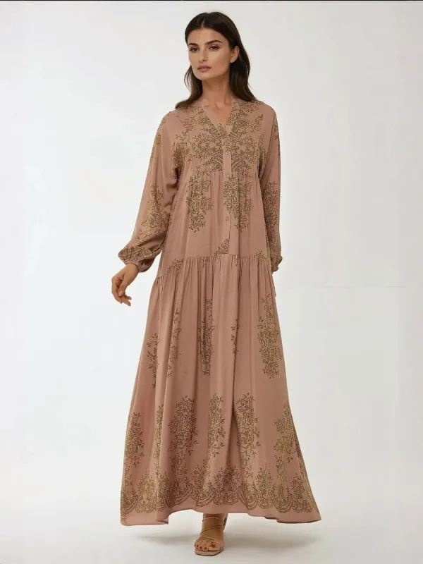 Design: Gevoerde zoom/rand; Type sluiting: Knoopsluiting; Materiaal: Viscose; Halstype: Uitgesneden hals; Kraag: Tuniek kraag; Details: Volant, Gedrapeerd; Extra's: All-over patroon; Lengte: Lang/maxi; Snit: Uitlopend; Pasvorm: Losse pasvorm; Armlengte: Lange mouw