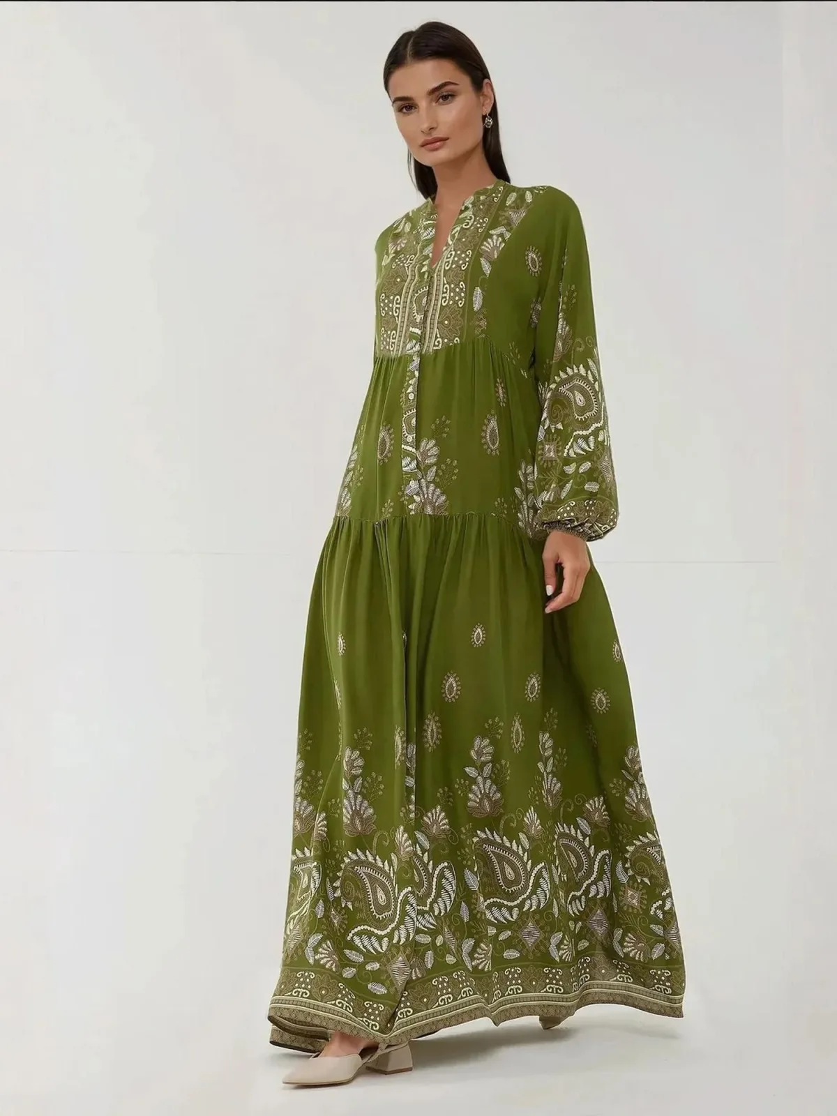 Design: Knop placket; Type sluiting: Knoopsluiting; Materiaal: Viscose; Halstype: V-hals; Motief: Paisley; Kraag: Tuniek kraag; Details: Gedrapeerd; Extra's: All-over patroon; Lengte: Lang/maxi; Snit: Uitlopend; Pasvorm: Normale pasvorm; Armlengte: Lange mouw