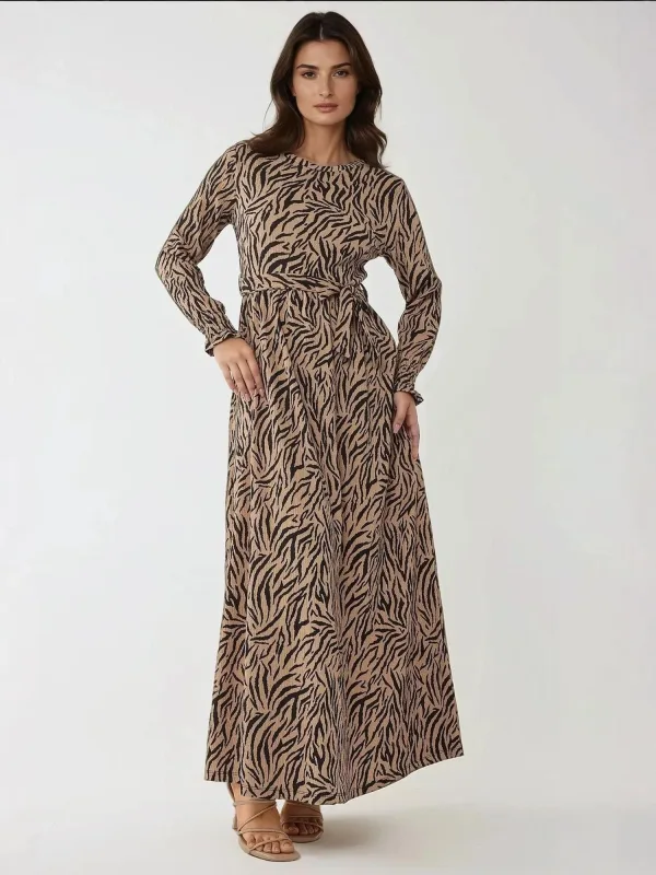Design: Gevoerde zoom/rand, Rechte zoom, Tailleriem; Halstype: Ronde hals; Motief: Dierenprint; Details: Ruches, Gedrapeerd; Extra's: All-over patroon, Met textuur; Lengte: Lang/maxi; Snit: Getailleerd; Pasvorm: Normale pasvorm; Armlengte: Lange mouw