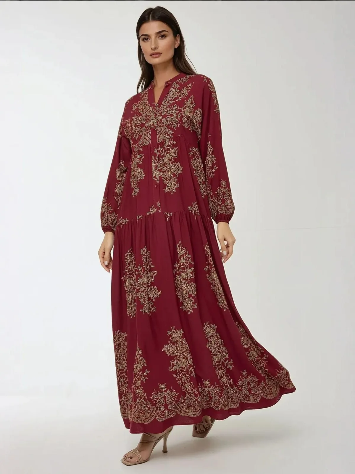 Design: Gevoerde zoom/rand; Type sluiting: Knoopsluiting; Materiaal: Viscose; Halstype: V-hals; Kraag: Tuniek kraag; Details: Volant, Gedrapeerd; Extra's: All-over patroon; Lengte: Lang/maxi; Snit: Uitlopend; Pasvorm: Normale pasvorm; Armlengte: Lange mouw