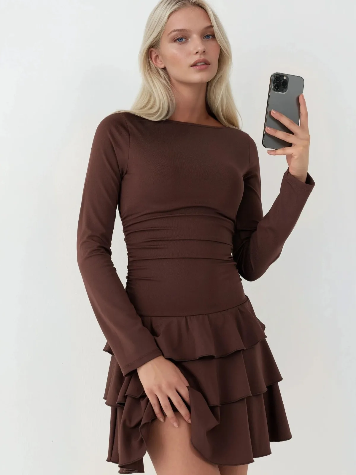Design: Gevoerde zoom/rand; Materiaal: Jersey; Halstype: Ronde hals; Motief: Effen; Details: Volant; Extra's: Voelt zacht aan; Lengte: Kort/mini; Snit: Figuur omarmend; Pasvorm: Aansluitende pasvorm; Armlengte: Lange mouw