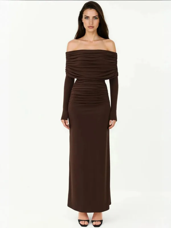 Design: Strapless/off-shoulder; Halstype: Carmen hals; Motief: Effen; Details: Gedrapeerd; Lengte: Lang/maxi; Snit: Getailleerd; Pasvorm: Slanke pasvorm; Armlengte: Lange mouw