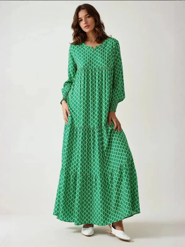 Design: Gevoerde zoom/rand; Materiaal: Viscose; Halstype: Uitgesneden hals; Details: Volant, Gedrapeerd; Extra's: All-over patroon; Lengte: Lang/maxi; Snit: Uitlopend; Pasvorm: Losse pasvorm; Armlengte: Lange mouw