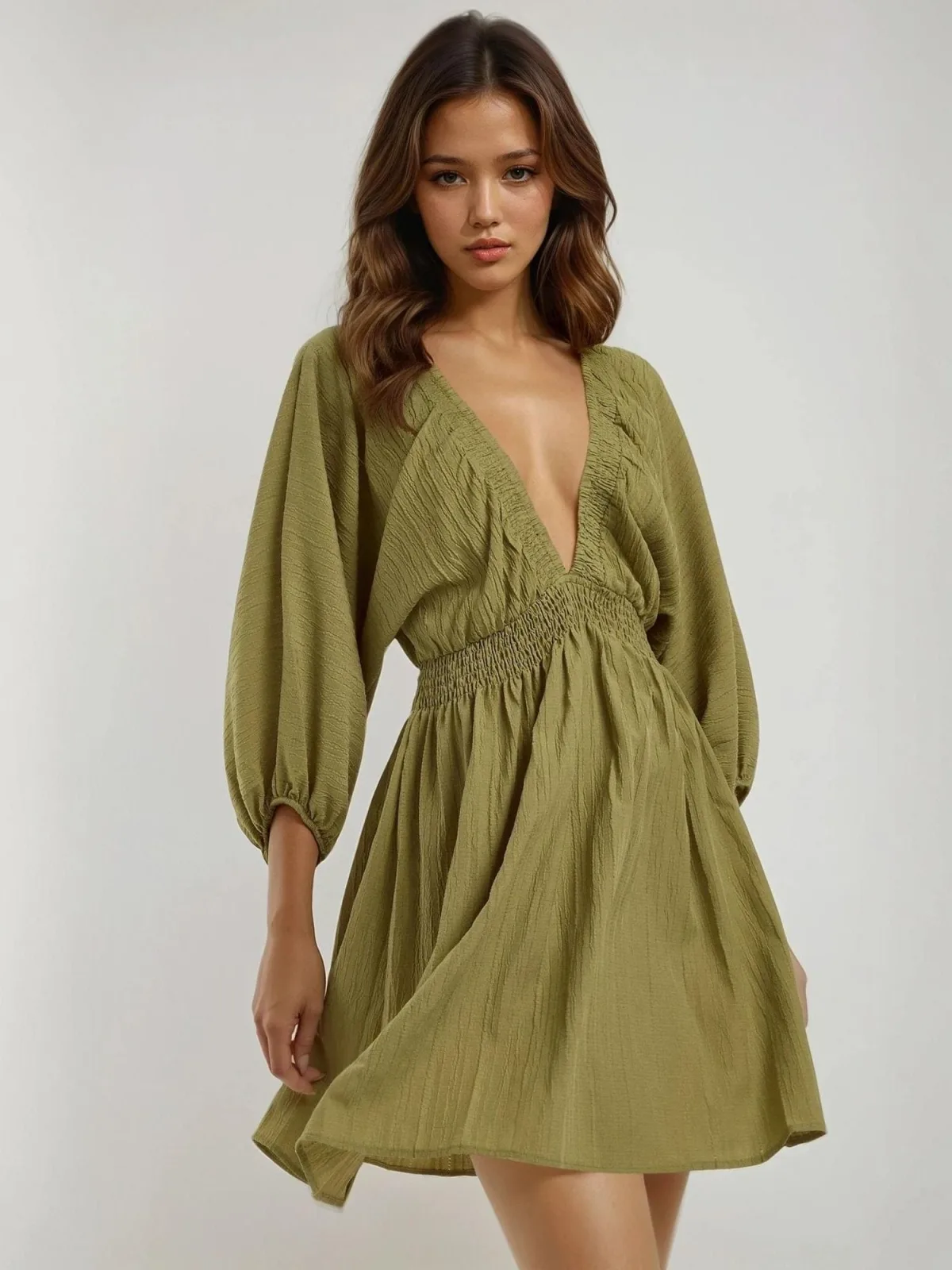 Design: Gevoerde zoom/rand, Elastische taille/zoom, Keyholesluiting, Diepe snit/decolleté; Type sluiting: Knoopsluiting; Materiaal: Katoen; Halstype: V-hals; Motief: Effen; Details: Cut-outs, Gedrapeerd; Extra's: Op staal naden, Met textuur; Lengte: Kort/mini; Snit: Uitlopend; Pasvorm: Normale pasvorm; Armlengte: Driekwart mouw