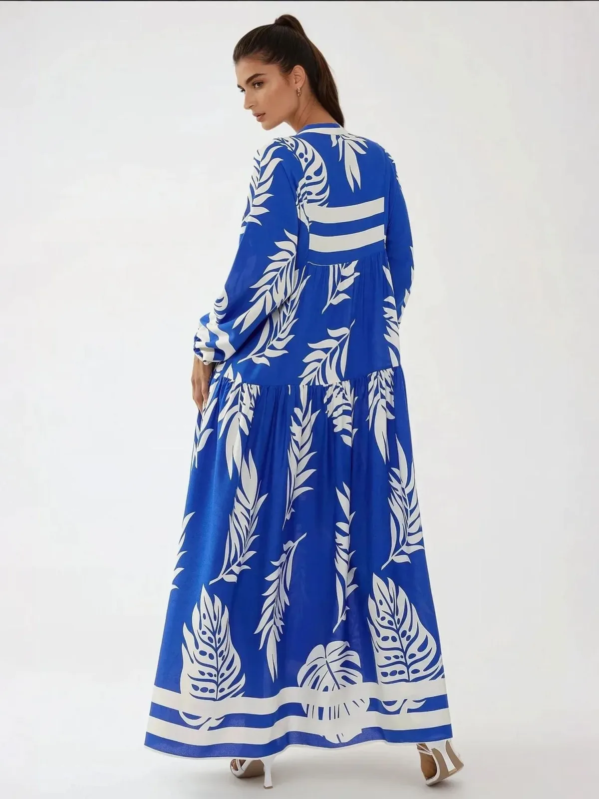 Design: Placket, Elastische taille/zoom; Type sluiting: Knoopsluiting; Materiaal: Viscose; Halstype: Uitgesneden hals; Motief: Bloemenprint; Details: Volant, Gedrapeerd; Extra's: All-over patroon, Gladde stof, Koele grip; Lengte: Lang/maxi; Snit: Uitlopend; Pasvorm: Losse pasvorm; Armlengte: Lange mouw