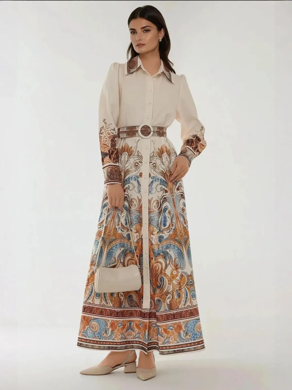 Design: A-lijn, Knop placket, Pofmouwen; Type sluiting: Knoopsluiting; Halstype: Ronde hals; Motief: Paisley; Kraag: Kentkraag; Details: Gedrapeerd; Extra's: All-over patroon, Voelt zacht aan; Lengte: Lang/maxi; Snit: Getailleerd; Pasvorm: Normale pasvorm; Armlengte: Lange mouw
